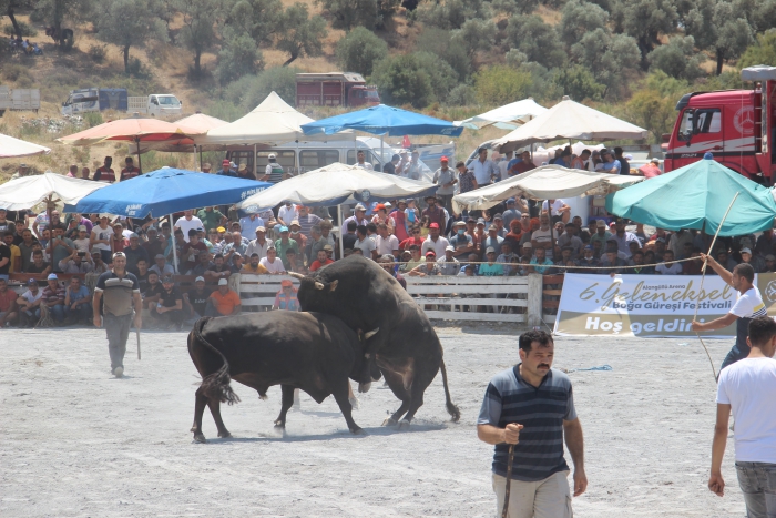 Aydın'da geleneksel boğa güreşleri Germencik Belediyesi'nin düzenlediği 'Boğa Güreşi Festivali' ile start aldı. Aydın merkez ve ilçelerinin yanı sıra Muğla ve İzmir'den de pehlivan boğaların katıldığı güreşlerde arenaya çıkan yaklaşık 70 çift boğa, pandemi dolayısıyla aylardır evlerinden çıkamayan bölge halkına unutulmaz bir gün yaşattı. Çatımların da oldukça dengeli yapıldığı güreşlerde boğalar, kilosu, boynuz durumu ve oyunlarına göre eşleştirildi. Germencik Belediye Başkanı Fuat Öndeş'in de izlediği güreşler dostluk içerisinde geçerken, zaman zaman rakibinden korkup kaçan boğalar heyecanlı anlar yaşanmasına neden oldu.