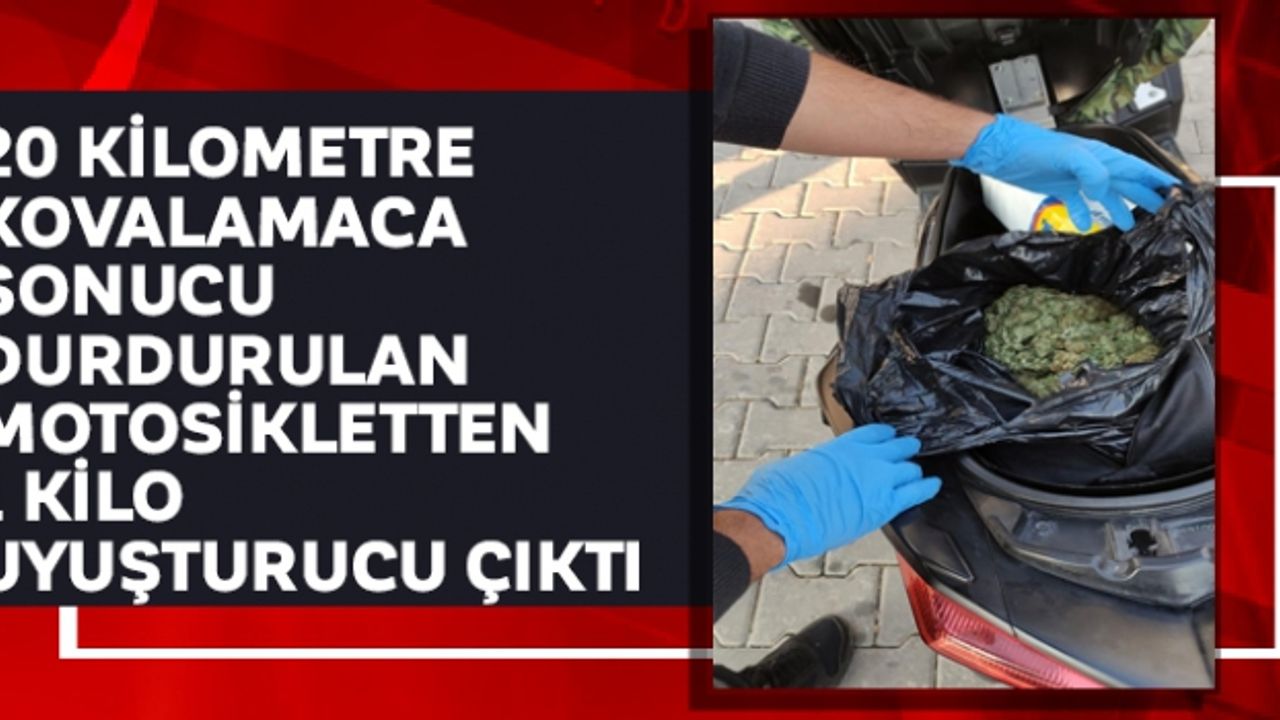Aydın'ın Kuşadası ilçesinde Narkotik Büro Amirliği ekipleri tarafından 20 kilometrelik kovalamaca sonucu durdurulan motosikletten 1 kilogram uyuşturucu madde ele geçirilirken, gözaltına alınan motosiklet sürücüsü çıkartıldığı mahkemece tutuklanarak cezaevine gönderildi.
