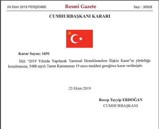 24 Ekim 2019 tarih ve 30928 sayılı Resmi Gazete'de yayımlanan 1691 Sayılı Cumhurbaşkanlığı Kararına göre Türkiye Tarım Havzaları Üretim ve Destekleme Modeli kapsamında ilimizde yetişen bazı ürünlere ödenecek destekleme miktarları açıklandı.