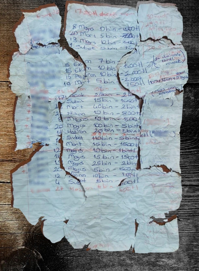 Bu arada, operasyon sırasında tefecilik yapan erkek aile bireylerinden kaçmak isteyen vatandaşları kurtarma bahanesiyle ağlarına düşüren kadınlardan biri olan Zeynep K.'nın (24) evine yapılan baskında ise ilginç olayların yaşadığı ortaya çıktı. Eve giren kadın polis arama yaparken Zeynep K.'nın çantasından çıkardığı bir kağıdı ağzına atıp yemeye çalıştığı, kadın polisin ise kağıdı çıkarmak için uğraştığı Zeynep K.'nın kağıdı yutmak için bir süre mücadele ettiği ancak kadın polisin buna izin vermediği öğrenildi. Ayrıca Zeynep K.'nın kağıdı yutmak için kadın polisin elini ısırdığı buna rağmen zanlı kadının kağıdı yutmasına izin verilmediği belirlendi. Zeynep K.'nın yırtarak yutmak istediği kağıt ağızdan çıkartıldıktan sonra birleştirildiğinde isim isim yüksek faize para verdiği şahısların isimleri ve ne kadar para verdiği bir liste ortaya çıktı. Kadının yutmaya çalıştığı listenin toplamda 450 bin liralık bir borç listesi olduğu belirlendi. Ayrıca Zeynep K.'nın polise yakalanmamak için sürekli kılık değiştirdiği saçını, sarı, kırmızı ve siyah renge boyattığı da öğrenildi. Zeynep K.'nın hiç bir işi olmamasına rağmen tefecilikten elde ettiği para ile lüks bir hayat yaşadığı öğrenildi. Zeynep K. ev hapsi tedbiriyle tutuksuz yargılanmak üzere serbest bırakılırken suçlamayı ablasının üstlendiği belirlendi.