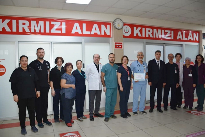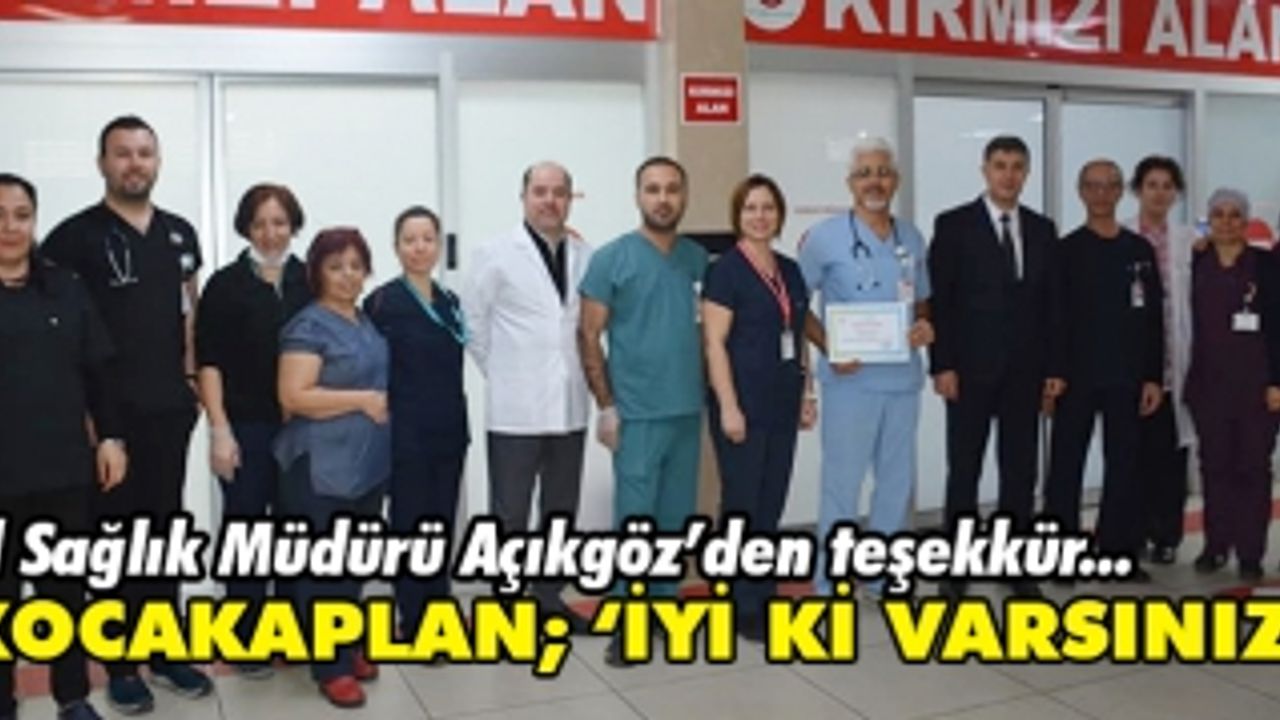 Aydın İl Sağlık Müdürü Dr. Osman Açıkgöz adına, Atatürk Devlet Hastanesi Acil Servis birimine teşekkür belgesini Hastane Başhekimi Op. Dr. Niyazi Kocakaplan takdim etti. Acil Servis biriminin zor bir görevi yerine getirdiğini kaydeden Başhekim Kocakaplan, 'Oldukça yoğun hasta başvurusu alan ve çok zor bir görevi yerine getiren, özverili çalışmalarla gerektiğinde sevdiklerinden ayrılıp hayat kurtarmak için 7/24 görevlerinin başında olan Acil Servis birimi fedakar çalışanlarına İl Sağlık Müdürümüz Sayın Dr.Osman Açıkgöz'ün teşekkür belgelerini takdim ettik. Üstün gayret ve özverili çalışmalarından dolayı tüm Acil Servis çalışanlarımıza teşekkür eder, çalışmalarında başarılar dilerim. İyi ki onlar var' dedi.