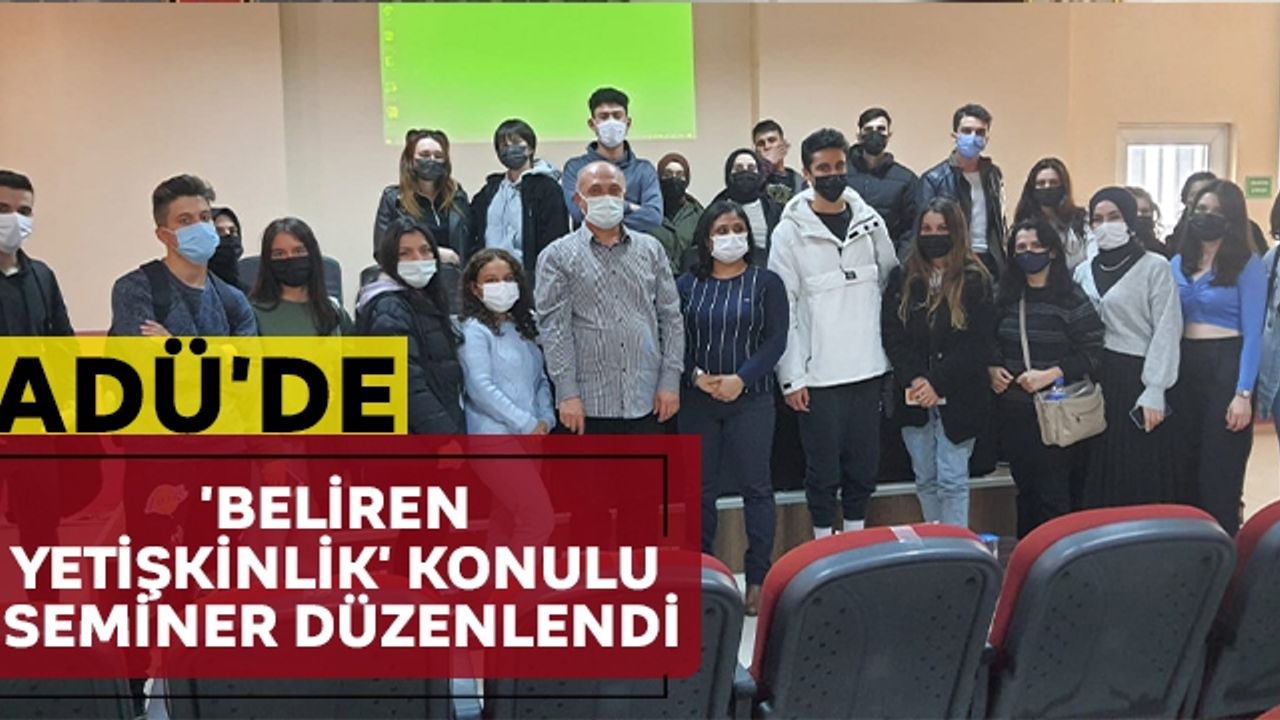 Öğrencilerinin gelişimlerine katkı sağlamak amacı ile düzenlenen etkinliğin konuğu ADÜ Gençlik Sorunları Araştırma ve Uygulama Merkezi Öğretim Görevlisi Fatma Evrim Güreşen oldu. Seminerde, 'Beliren Yetişkinlik' konu başlığı altında kimlik arayışı, istikrarsızlık, kendine odaklanma, arada kalmışlık, sonsuz olanaklara sahip olma hakkında öğrencilere bilgi verildi. İnteraktif olarak gerçekleştirilen ve 70 öğrencinin katıldığı etkinlikte, öğrencilerin soruları yanıtlandı. Etkinlik, Dr. Öğr. Üyesi Hüseyin Nail Akgül'ün, Öğretim Görevlisi Fatma Evrim Güreşen'e teşekkür etmesi ve öğrencilerin hatıra fotoğrafı çekimi ile sona erdi.