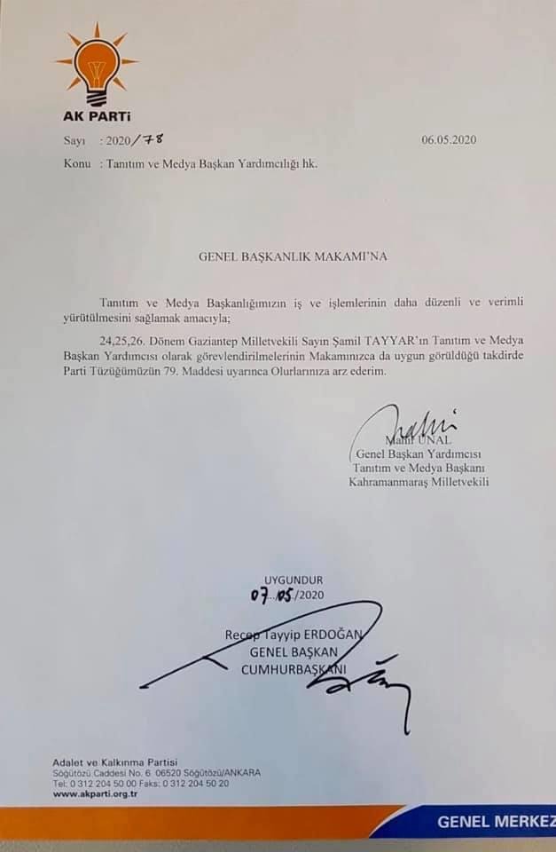 Tanıtım ve Medyadan Sorumlu Genel Başkan Yardımcısı Mahir Ünal'ın, Şamil Tayyar'ın başkan yardımcısı olarak atanmasına ilişkin yazısı Cumhurbaşkanı ve AK Parti Genel Başkanı Recep Tayyip Erdoğan tarafından onaylandı.