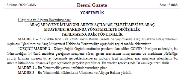 Ulaştırma ve Altyapı Bakanlığı, Resmi Gazete'de yayımladığı yönetmelikle motorlu taşıt sahipleri ve aracının muayene süresi gelenler için değişikliğe gitti. Değişiklikte 'korona virüs' pandemisi nedeniyle muayene süresi gelen ve yaptıramayanlar için 3 aylık ek süre tanınırken, süre sonunda 45 gün içinde araç muayenesinin yaptırılması gerektiği kaydedildi. Ayrıca bu sürenin gerektiği takdirde Ulaştırma ve Altyapı Bakanlığı tarafından uzatılabileceği de bildirildi.