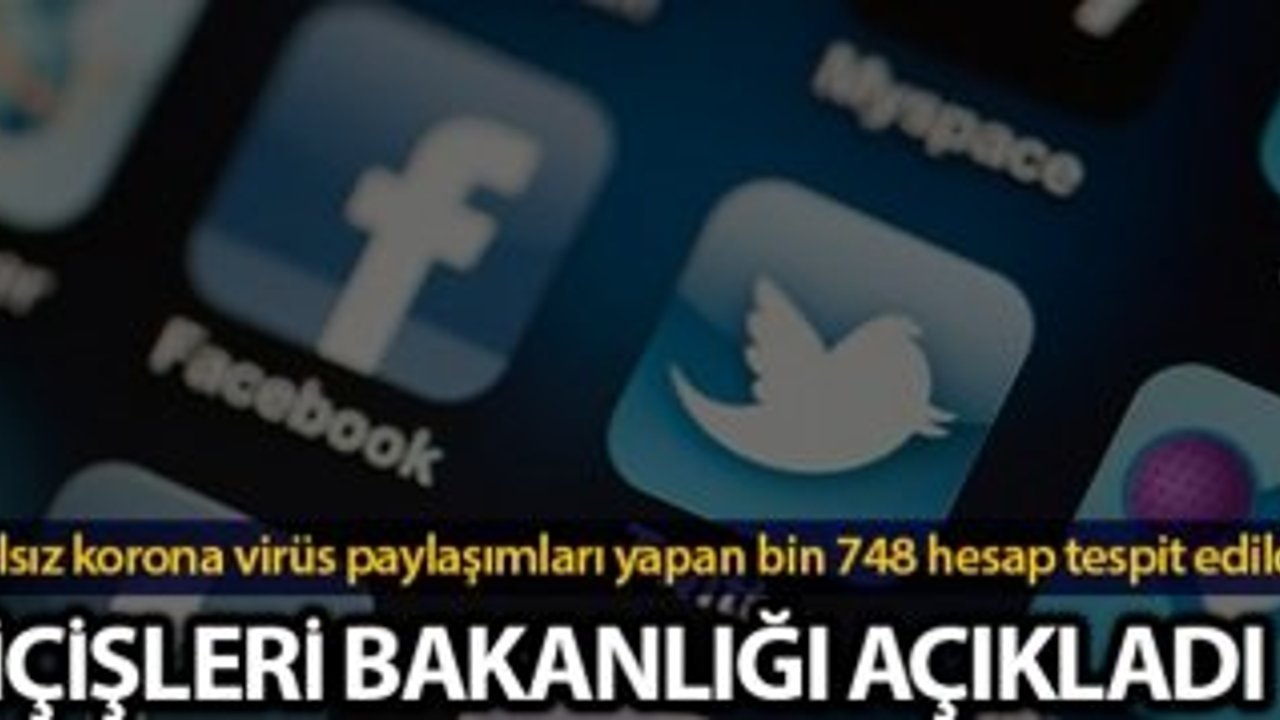 İçişleri Bakanlığı, sosyal medyada asılsız korona virüs paylaşımları ve terör propagandası yapan bin 748 hesap tespit edildiğini ve gerekli adli işlemin başlatıldığını açıkladı.