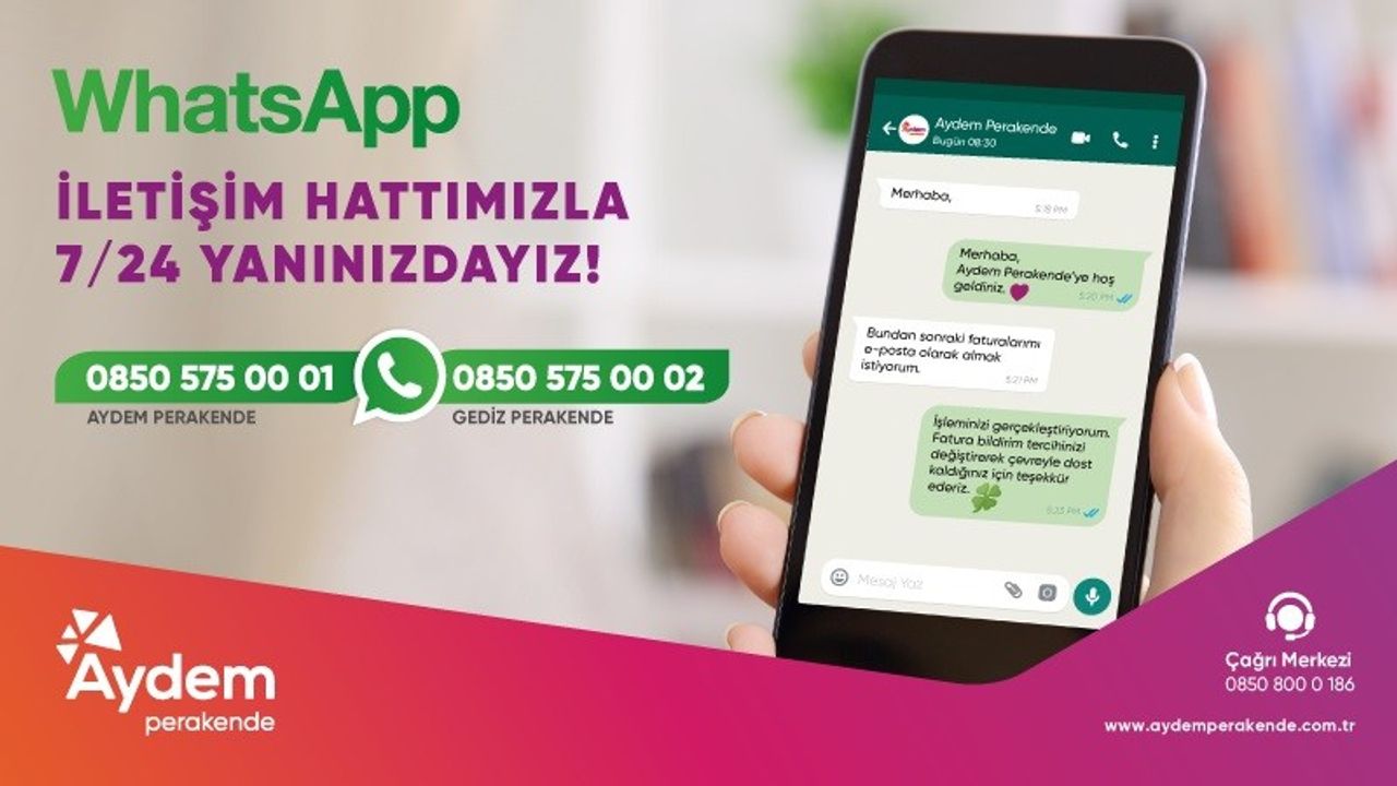 Aydem Perakende Aydın, Denizli ve Muğla illerinde 0850 575 00 01, Gediz Perakende ise İzmir ve Manisa illerinde 0850 575 00 02 numaralı kurumsal WhatsApp iletişim hattıyla müşterilerine fatura ve abonelik işlemleri, bilgi güncelleme, kampanya ve indirimli elektrik gibi birçok konuda etkin şekilde hizmet sunacak.