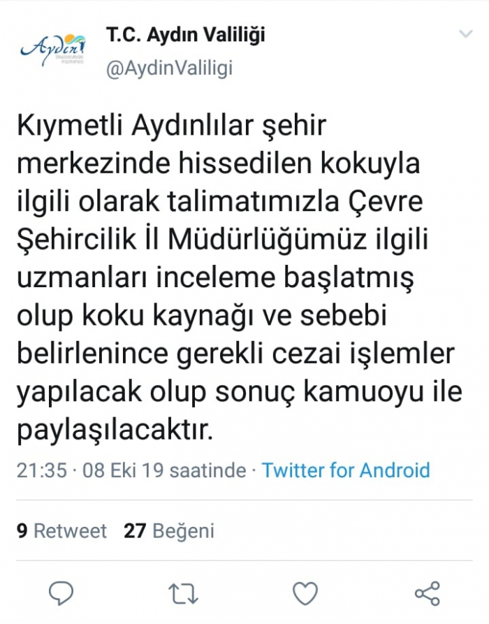 Durum hakkında Aydın Valiliği twitter sayfasında 'Kıymetli Aydınlılar şehir merkezinde hissedilen kokuyla ilgili olarak talimatımızla Çevre Şehircilik İl Müdürlüğümüz ilgili uzmanları inceleme başlatmış olup koku kaynağı ve sebebi belirlenince gerekli cezai işlemler yapılacak olup sonuç kamuoyu ile paylaşılacaktır' denildi.