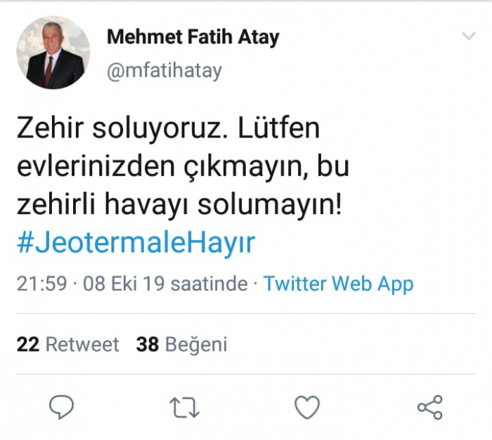 Efeler Belediye BAŞKANI Fatih Atay twitter hesabından yaptığı paylaşım ve Efeler BelediyesiKısa Mesaj Servisi(SMS) sisteminden 'Zehir soluyoruz. Lütfen evlerinizden çıkmayın, bu zehirli havayı solumayın! #JeotermaleHayır şeklinde paylaşımlar yapıldı.