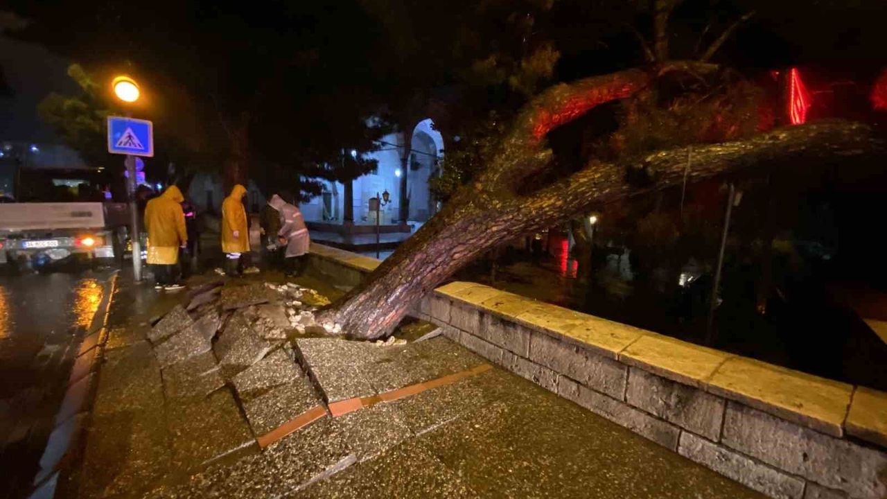 Olay, Cumhuriyet Mahallesi Adnan Menderes Bulvarı üzerindeki Bey Camii önünde saat 23.00 sıralarında meydana geldi. Edinilen bilgiye göre, gün boyunca süren sağanak yağmur nedeniyle zeminin yumuşaması sonucu kaldırımda bulunan asırlık çam ağacı kökünden sökülerek büyük bir gürültüyle devrildi. Yaya ve araç trafiğinin en yoğun olduğu bölgede yaşanan olayda, gece saatlerinde yolun boş olması muhtemel bir facianın önüne geçti. Ağacın devrildiğini gören vatandaşlar durumu 112 Acil Çağrı Merkezi'ne bildirdi. İhbar üzerine hızla olay yerine gelen polis ekipleri çevre güvenliği aldı. Aydın Büyükşehir Belediyesi Park ve Bahçeler Daire Başkanı Çağlar Tuğrul'un öncülüğündeki ekipler de ağacın bulunduğu yerden kaldırılması için çalışma başlattı. Ekiplerin çalışmaları sonucu ağaç kaldırılarak kaldırım yaya trafiğine açıldı.