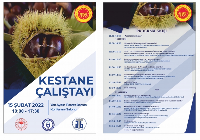 Aydın Ticaret Borsası tarafından Avrupa Birliği coğrafi işaret tescili alınan ve ülkemiz kestane üretiminin yüzde 33,5'lik kısmına sahip olan Aydın'da kestane üretiminin bölgemiz ve ülkemiz ekonomisine katkıları, sektörün geleceği için atılması gereken adımlar kestane çalıştayında konuşulacak. Ana teması 'Kestanenin Dünü, Bugünü ve Geleceği' olan çalıştay, 2 oturumda gerçekleştirilecek. Aydın Adnan Menderes Üniversitesi Ziraat Fakültesi Dekanı Prof. Dr. İbrahim Gençsoylu moderatörlüğünde gerçekleştirilecek olan çalıştayın ilk oturumunda 6 farklı konuya değinilecek. Kestanede gübrelemenin nasıl yapılması gerektiği, Aydın Adnan Menderes Üniversitesi Ziraat Fakültesi'nin Kestane Yetiştiriciliğinde Son 28 Yıl Araştırması ve Geleceğe Projeksiyonu, Önemli Kestane Zararları ve Çözüm Önerileri, Kestane Kanseri ile Mücadele ve Çözüm Önerileri, Kestane Yetiştiriciliğinde Mekanik Hasat Olanakları ile Gelecekte Tarım konularına yer verilecek. Kestane ile ilgili Ar-Ge Çalışmaları konusu ile başlayacak olan II. oturumda ise Kestane Yetiştiriciliğinde Dikkat Edilmesi Gerekenler ve Yaşanan Sorunlar, Kestaneyi un haline getirme çalışmaları, Kestanenin Sofralara Yolculuğu, Desteklemeler ile Kestanenin Ticari Değeri konuşulacak.