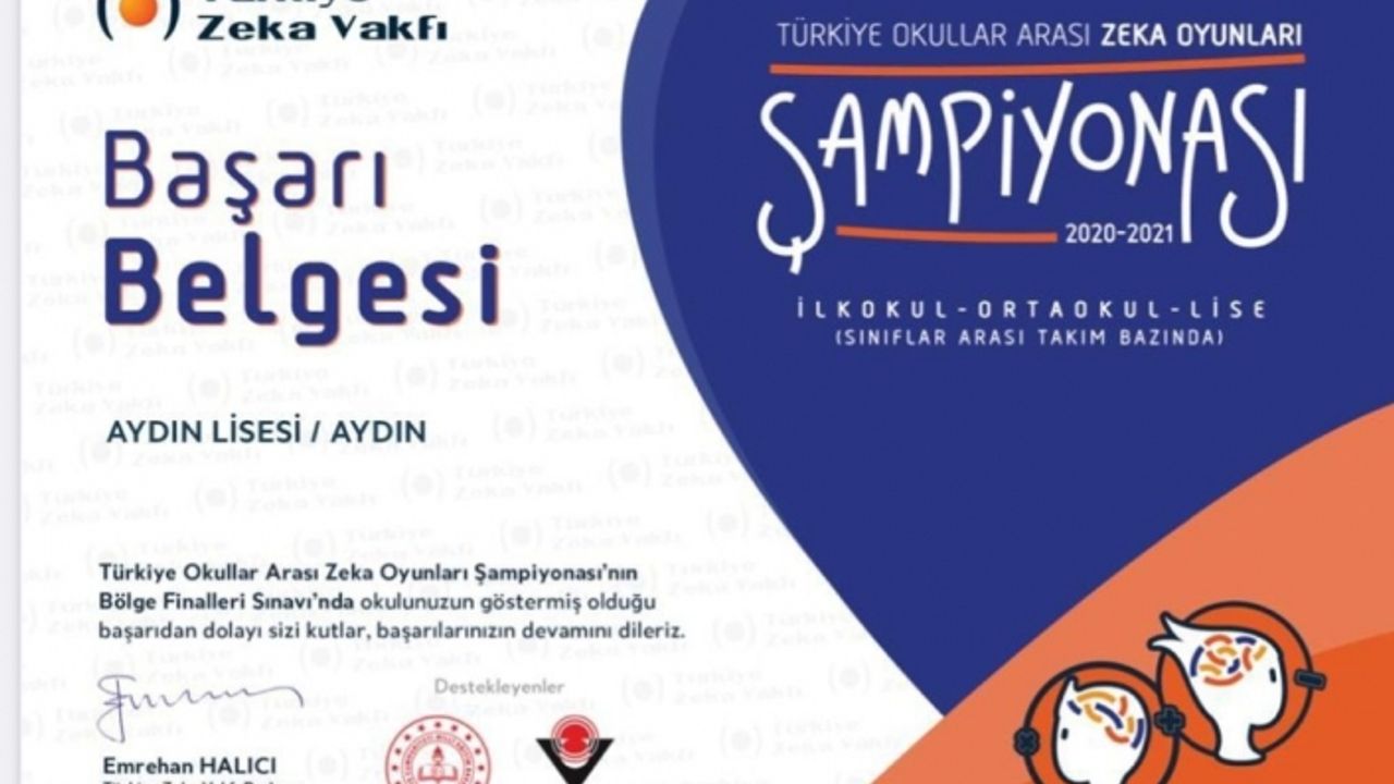 Milli Eğitim Bakanlığı´nın izni ve TÜBİTAK´ın destekleri ile düzenlenen, Türkiye Okullar Arası Zeka Oyunları´nın il finalleri geçtiğimiz Kasım ayında gerçekleştirildi. 23 Ocak da Ege bölge elemelerinde, il finallerinde ilk 5 sırayı alan okullar ve bunlara ek olarak da il finalleri Sınavında ilk yüzde 30´luk dilime girip illerini temsil eden bütün okulları geride bırakan Aydın Lisesi Zeka Oyunları Takımı `Türkiye Okullar Arası Zeka Oyunları Şampiyonası´nda Türkiye finallerine kalmayı başardı. Türkiye finalleri sınavına Türkiye´nin 7 coğrafi bölgesi dikkate alınarak her bölgedeki bölge finalleri sınavında ilk 5 sırayı alan 35 okul ve bu okullar dışında bölge finalleri sınavında ilk sırayı alan 65 okul olmak üzere toplam 100 okul katılacak. Aydın Lisesi Zeka Oyunları Takımı da 20 Mart 2021 tarihinde yapılacak Türkiye Finalleri Sınavı´nda Aydın´ı temsil edecek.