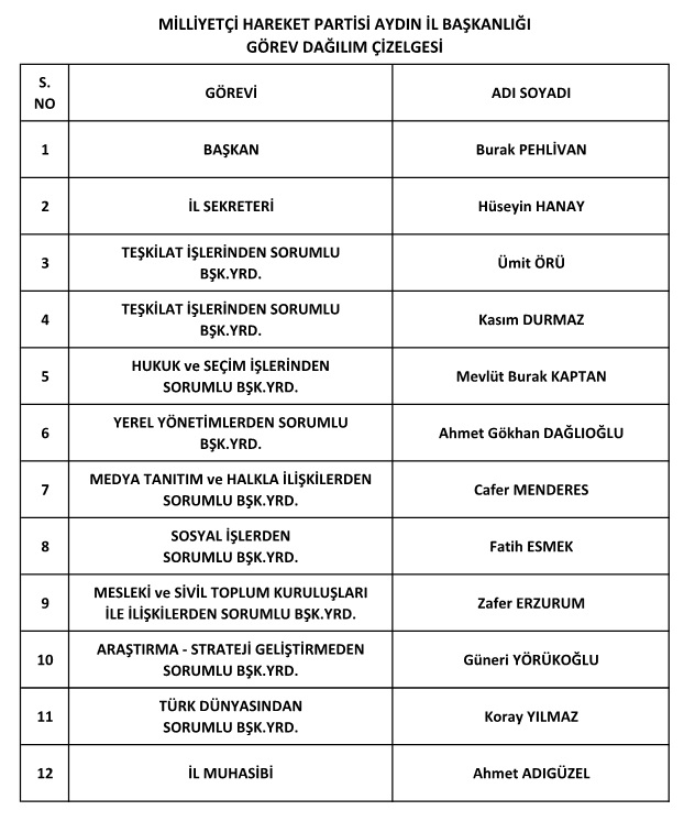 MHP Aydın İl Başkanı Burak Pehlivan başkanlığındaki yeni yönetimin görev dağılımı şu şekilde oluştu: