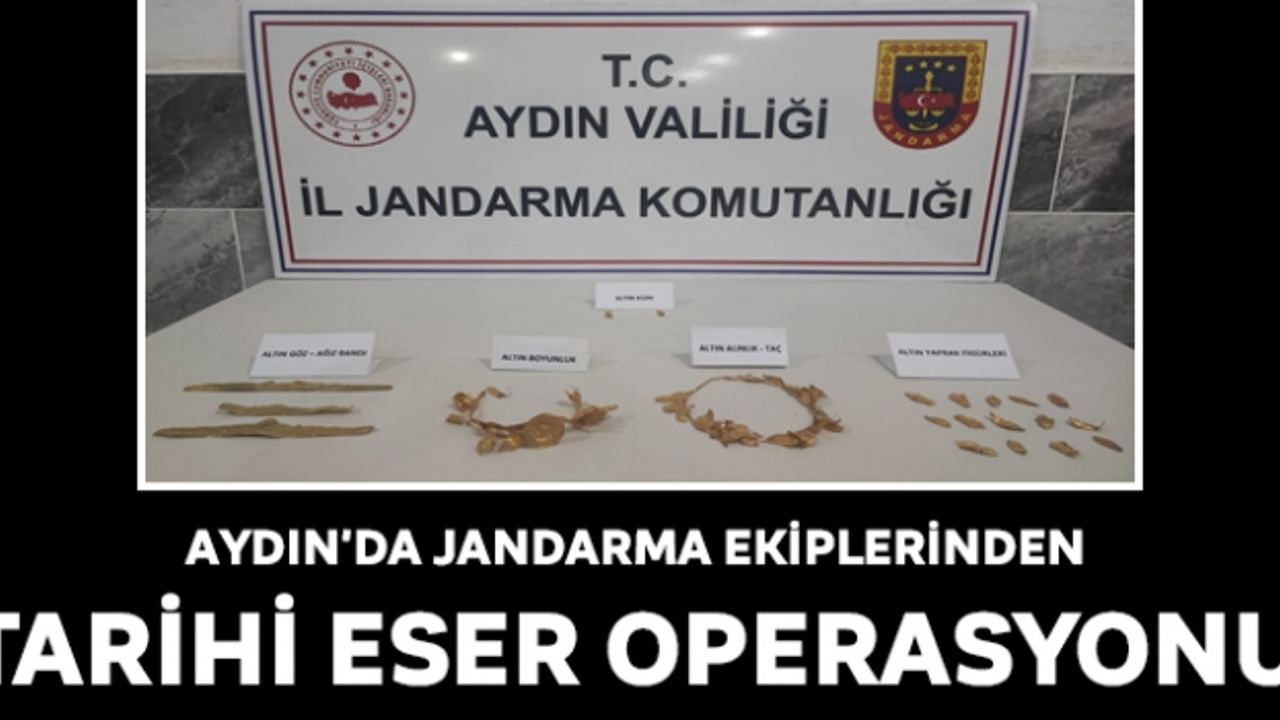 Aydın İl Jandarma Komutanlığı tarafından, kaçakçılık kanununa muhalefet suçuna yönelik çalışmalar aralıksız olarak devam ediyor. Edinilen bilgiye göre, adli makamlardan alınan arama ve yakalama kararına istinaden G.K. isimli şüpheli şahsın yakalanmasına yönelik çalışma başlatıldı. Jandarma ekipleri tarafından şahsın evine operasyon düzenlenirken, yapılan aramalarda Antik Çağ Roma Dönemine ait kral veya imparatorların mezara konulmadan önce definlerinde cesetlerine takı olarak takılan; 6 parça halinde 1 adet altın göz ve ağız bandı, 1 çift balık figürlü altın küpe, 5 parça halinde 1 adet altın alınlık taç, 3 parça halinde altın boyunluk, 20 adet altın yaprak figürü olan piyasa değeri yüksek altından tarihi eserler ele geçirildi. Ev sahibi G.K. yakalanarak gözaltına alındı.