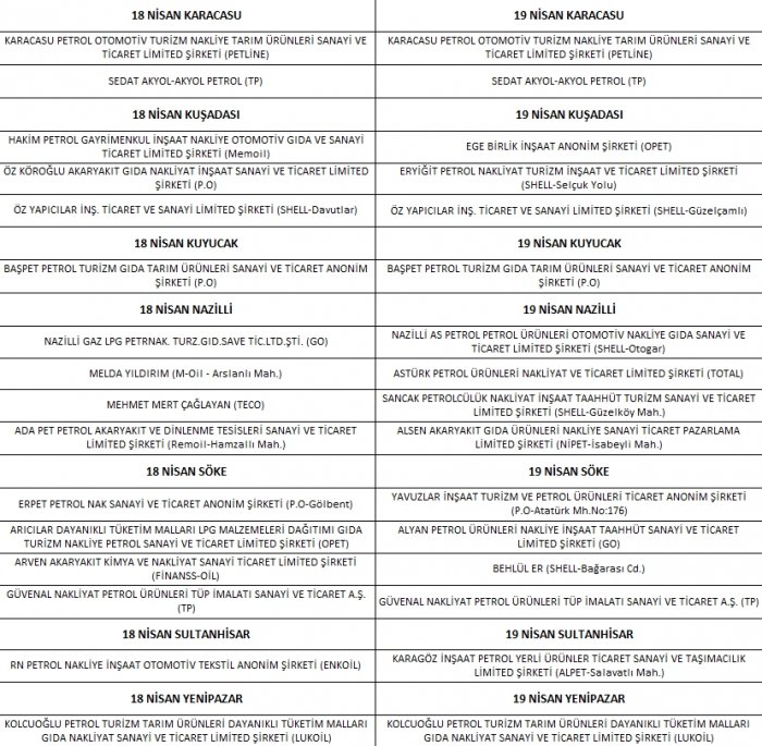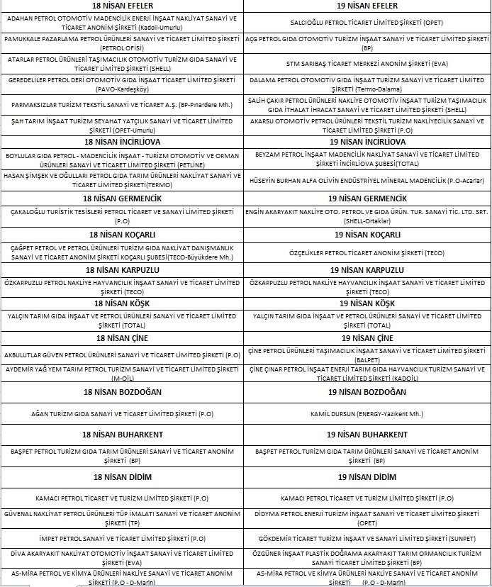 Bu hafta sonu sokağa çıkma yasağı süresince Aydın ilinde açık olacak akaryakıt istasyonları şu şekilde;
