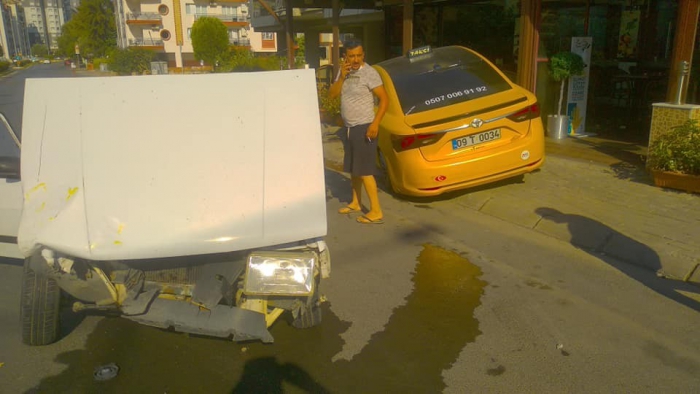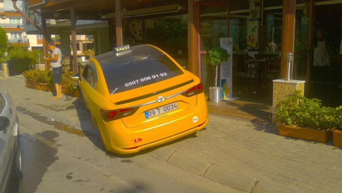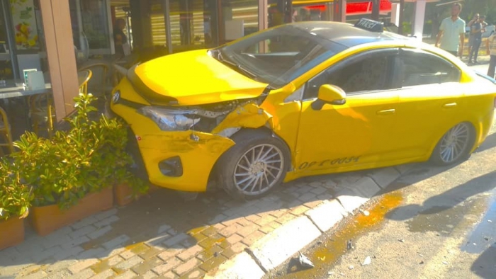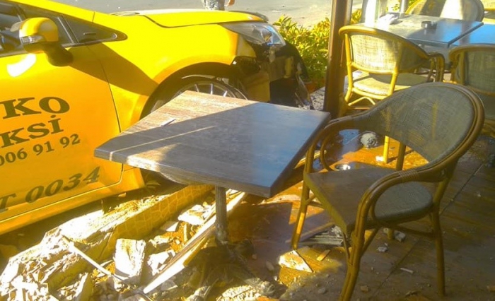 Kaza, Aydın'ın Efeler ilçesi Girne Mahallesi Şehitler Bulvarı üzerinde meydana geldi. Edinilen bilgiye göre, bir ticari taksi ve hususi otomobil kavşakta çarpıştı. Çarpmanın etkisi ile savrulan ticari taksi büyük bir gürültü ile yolun kenarında bulunan kafenin bahçe duvarını yıkarak masa ve sandalyelerin arasına daldı. Kazayı gören vatandaşlar durumu polis ekiplerine haber verdi. Olay yerine polis ekiplerinin yanı sıra tedbir amaçlı 112 Acil Sağlık Ekipleri de sevk edildi.