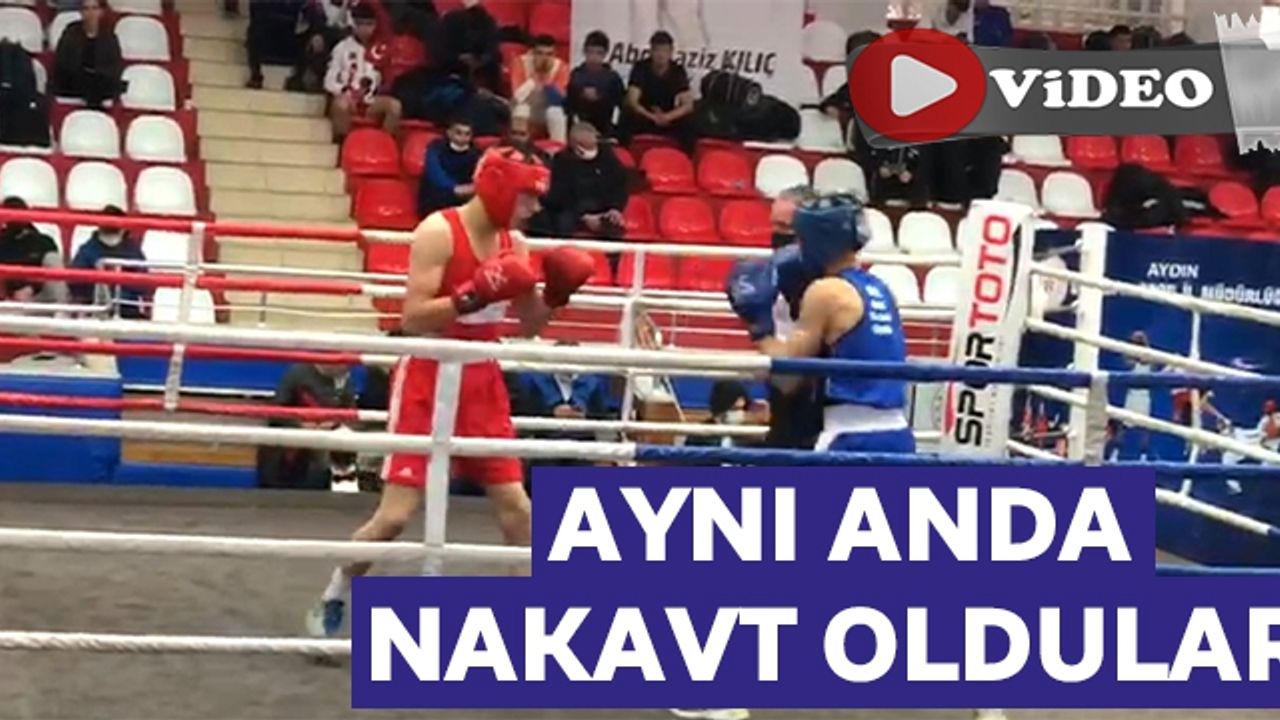 Genç Erkekler Türkiye Boks Şampiyonası, Aydın Gençlik ve Spor İl Müdürlüğü ev sahipliğinde Atatürk Spor Salonu'nda gerçekleşti. 38 ilden 220 sporcunun katıldığı şampiyona final müsabakaları ile devam ederken, ringde nadir bir ihtimalle yaşanacak olay meydana geldi. Kazanmak için ringe çıkan 2 boksör, kozlarını paylaşırken birbirlerini nakavt etme düşüncesiyle hamleler yaptı. Çekişmeli geçen müsabakada birbirine aynı anda yumruk atan 2 boksör, bir anda kendilerini yerde buldu. Boks tarihinde nadir görüldüğü belirtilen bu olayda iki boksör de aynı anda nakavt olurken, maçın hakemi de bir anda ne yapacağını şaşırdı. Hakem taraflardan birinin kalkmasını beklerken, iki taraf da bir süre yerde kaldı. Sporcular güçlükle ayağa kalkarken mavi köşede yer alan boksör maça devam edemedi. Hakemin maçı tamamlamasının ardından kırmızı köşede yer alan boksör müsabakayı kazandı.
