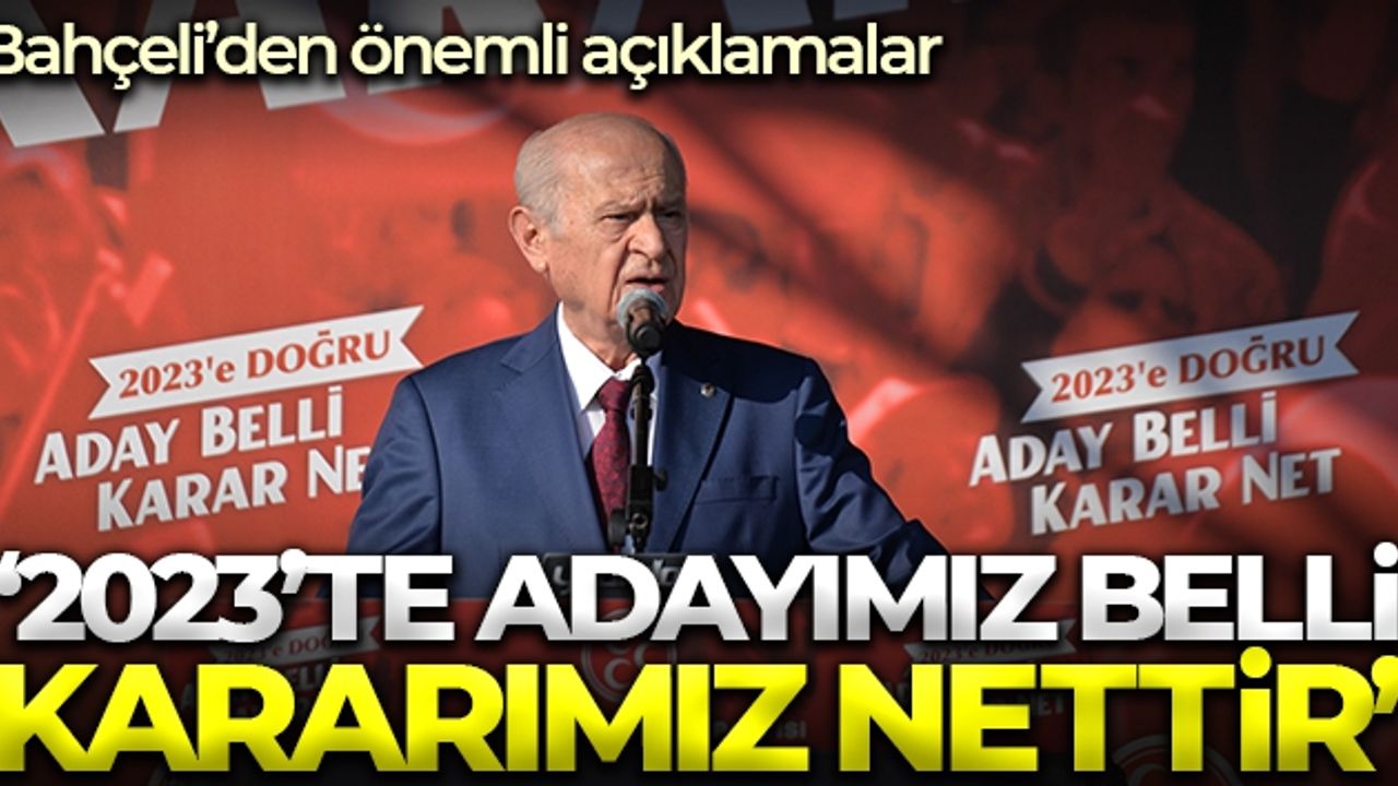 MHP Genel Başkanı Devlet Bahçeli, 2023'te yapılacak olan Cumhurbaşkanı ve Milletvekili Genel Seçimleri çalışmaları kapsamında ilk mitingini '2023'e Doğru: Aday Belli, Karar Net' temasıyla Sivas'ta başlattı. Bahçeli Sivas'taki konuşmasında, '2023'te adayımız belli, kararımız nettir. Derdimiz milli bekamız ve egemenlik hakkımızdır.' ifadelerini kullandı.