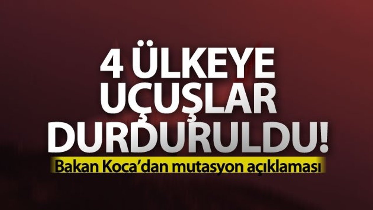 Sağlık Bakanı Koca, 'Koronavirüsün mutasyonuyla İngiltere'de bulaş hızının arttığı bildirilmiştir. Cumhurbaşkanımızın talimatı, Ulaştırma ve Altyapı Bakanlığımızın koordinasyonu ile tedbiren; İngiltere, Danimarka, Hollanda ve Güney Afrika'dan ülkemize olan uçuşlarda geçici durdurma kararı alınmıştır.'