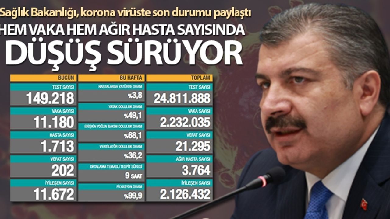 Toplam vaka sayısının 2 milyon 232 bin 35 olduğu, bugün iyileşen 11 bin 672 kişiyle birlikte toplam iyileşen hasta sayısının 2 milyon 126 bin 432'ye yükseldiği, toplam hastalarda zatürre oranının yüzde 3,8, toplam ağır hasta sayısının ise 3 bin 764 olduğu açıklandı.