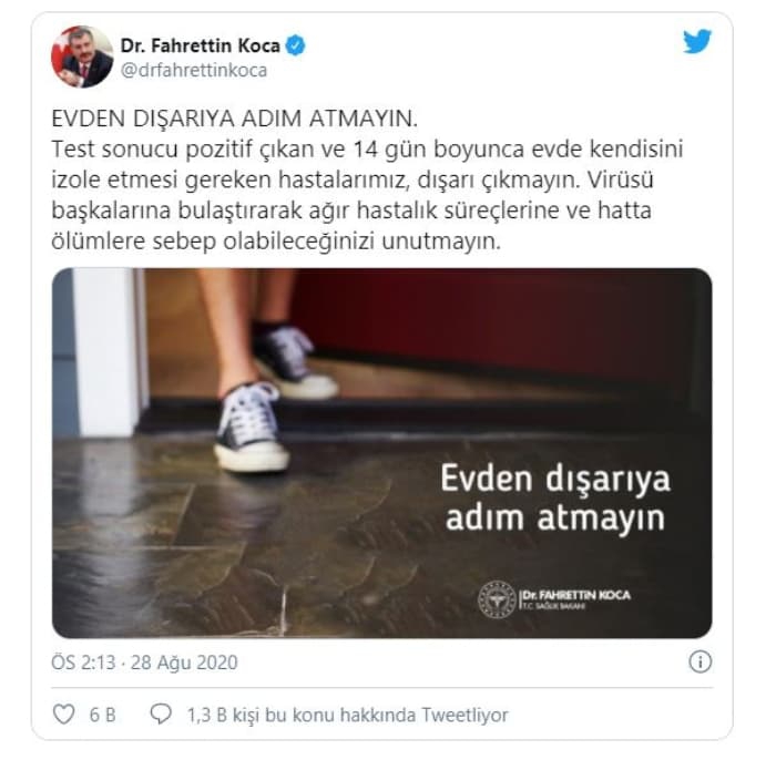 Koronavirüs hastalarını 'Evden dışarıya adım atmayın' notuyla uyaran Koca, şu ifadelere yer verdi: