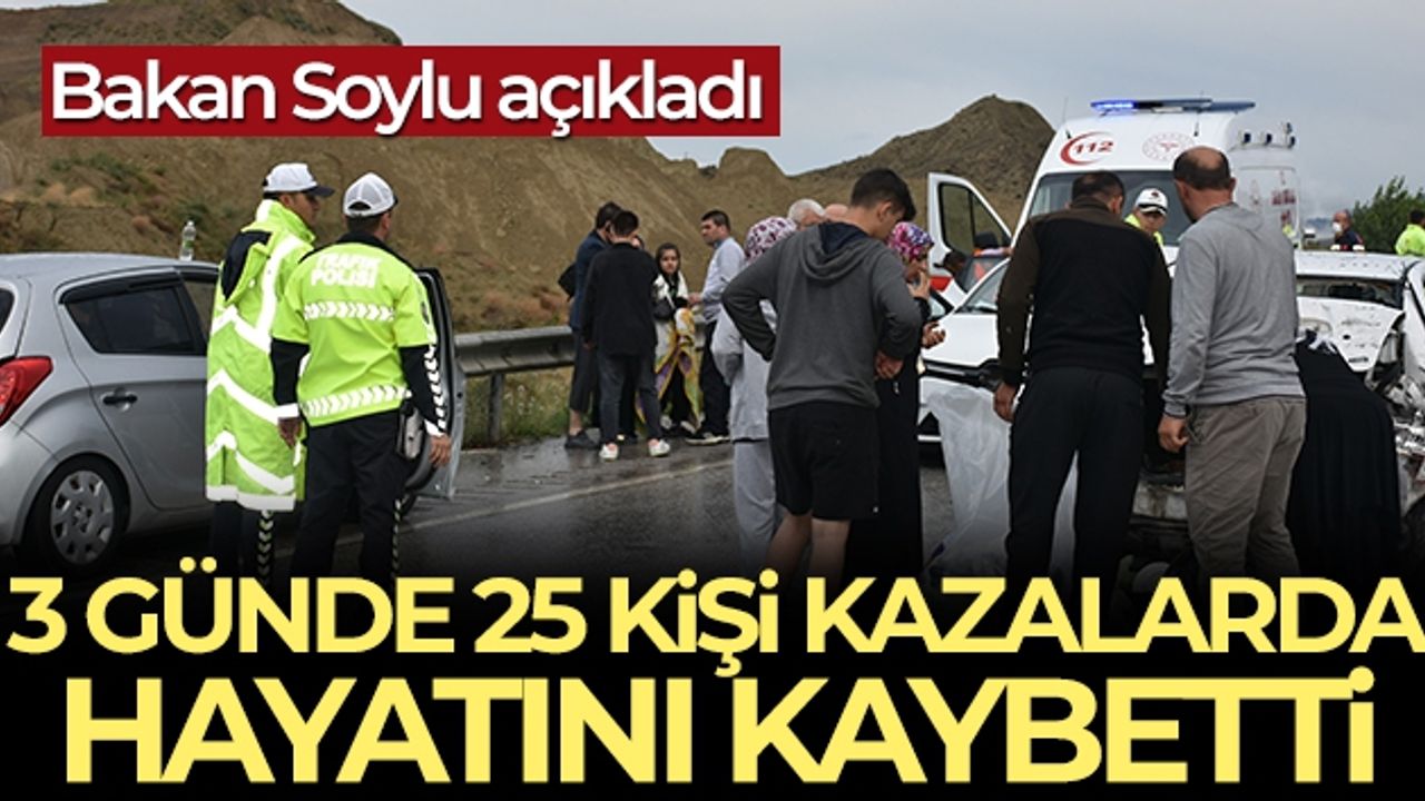 İçişleri Bakanı Süleyman Soylu, arefe günü ve bayramın ilk gününde 25 kişinin trafik kazasında hayatını kaybettiğini açıkladı. Vatandaşlara trafikte dikkatli olmaları yönünde çağrıda bulunana Bakan Soylu, sosyal medya hesabından yaptığı paylaşımda şu ifadelere yer verdi:
