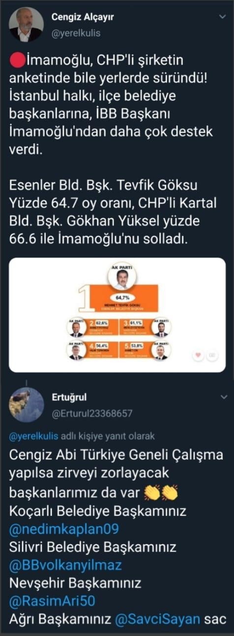 Koçarlı Belediye Başkanı Nedim Kaplan'ın, 31 Mart 2019 Yerel Seçimleri'nden bu yana geçen 21 aylık sürede sosyal belediyecilik projelerinin yanı sıra hükümet yatırımlarının ilçede hayata geçmesi noktasındaki bireysel girişim ve çabaları, Türkiye Geneli'nde de adından söz ettirmeye başladı. CHP'li bir anket şirketi tarafından İstanbul'daki belediye başkanlarını kapsayan anket sonuçlarıyla ilgili Twitter hesabından paylaşımda bulunan Gazeteci Cengiz Alçayır, İstanbul Büyükşehir Belediye Başkanı Ekrem İmamoğlu'nun, anket sonuçlarına göre yüzde 64,7 oy oranı alan Esenler Belediye Başkanı Tevfik Göksu'nun gerisinde kaldığını açıkladı. Alçayır'ın paylaşımına çok sayıda beğeni ve yorum gelirken, bir takipçisinin Türkiye geneli anket çalışması yapıldığı takdirde Koçarlı Belediye Başkanı Nedim Kaplan'ın Cumhur İttifakı belediye başkanları arasında zirveyi zorlayacak 4 isimden biri olarak gösterilmesi dikkat çekici bulundu.