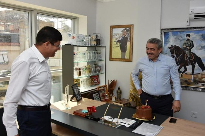 Aydın’ın Nazilli ilçesinin Belediye Başkanı Kürşat Engin Özcan, önceki dönem belediye başkanı MHP aydın İl Başkanı Haluk Alıcık’a doğum günü sürprizi yaptı.
