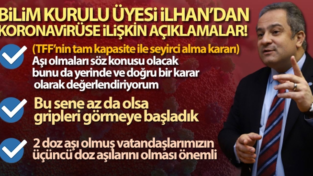 Sağlık Bakanlığı Koronavirüs Toplum Bilimleri Kurulu Üyesi ve Gazi Üniversitesi Tıp Fakültesi Dekanı Prof. Dr. Mustafa Necmi İlhan, Türkiye Futbol Federasyonu'nun (TFF) 9 Kasım'dan itibaren tüm maçların yüzde 100 seyirci doluluk oranıyla oynanacağı açıklamasını İHA muhabirine değerlendirdi. Prof. Dr. İlhan, 'Futbol Federasyonu'nun aldığı karar çok yerinde. Zira aşı takvimini tamamlamış kişilerin stadyuma alınacak olması bulaşı engelleyecek. Hem de stadyumda enfekte olan kişilerin daha sonra evlerine bu hastalığı götürüp, evlerinde bulunan kişileri enfekte etmesini engelleyecek.