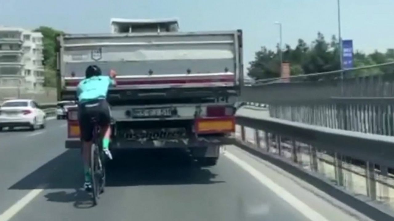 E-5 Karayolunda Küçükçekmece Cennet Mahallesi mevkiinde ilerleyen bir bisikletli görenlerin yüreklerini ağızlara getirdi. E-5 karayolundaki bisikletli, bir tırın arkasına yanaşıp, kasadaki iplerden tutunarak uzun bir süre ilerledi. Yoldaki hafif rampada tırdan tutunmakta zorlanan bisikletli pedallarını hızla çevirerek tırın dibine girmeye çalıştı.