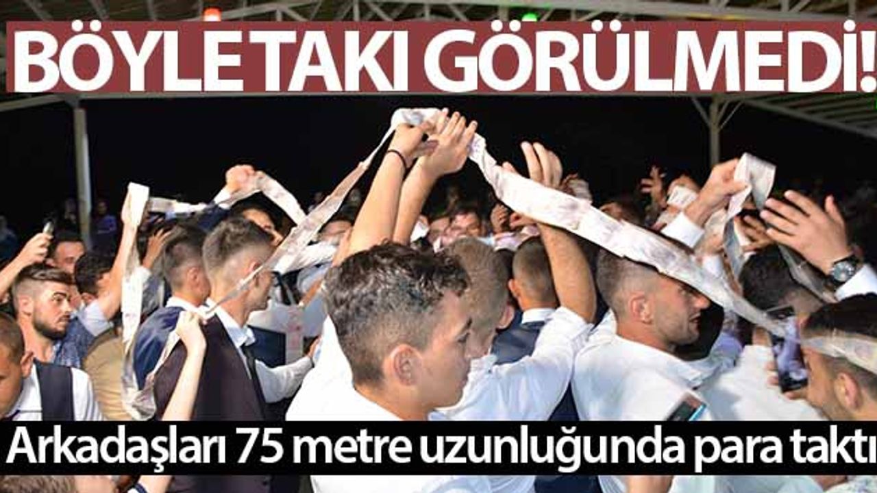 Çiftin arkadaşları tarafından toplu iğne yardımıyla birleştirilen ve yaklaşık 75 metre uzunluğuna ulaşan para takıldı. Düğünde takı merasimine geçildiği esnada çiftin arkadaşları, 75 metre uzunluğundaki para takısını çifte takmak istedi. Görenleri adeta şaşkına çeviren takıda gelin ve damat zor anlar yaşadı.