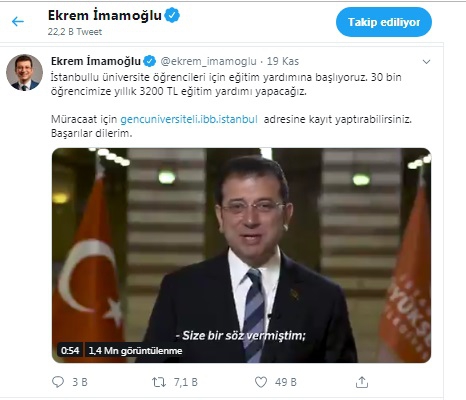İstanbullu üniversite öğrencileri için eğitim yardımına başlıyoruz. 30 bin öğrencimize yıllık 3200 TL eğitim yardımı yapacağız. Müracaat için https://gencuniversiteli.ibb.istanbul adresine kayıt yaptırabilirsiniz.