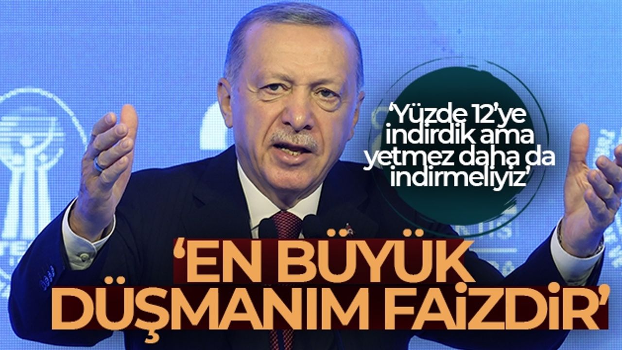 Cumhurbaşkanı Recep Tayyip Erdoğan, 'En büyük savaşım, faizledir. En büyük düşmanım faizdir. Şu anda yine faizi 12'ye kadar düşürdük. Yeter mi? Yetmez. Bunun daha da inmesi lazım' dedi.