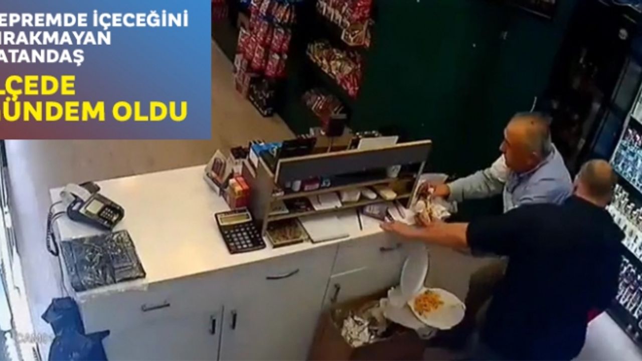 Aydın'ın Kuşadası ilçesinde dün 4.1 büyüklüğünde meydana gelen deprem sırasında bir işletmede yemek yiyen vatandaş, deprem paniği ile dışarı çıkarken içeceğini de yanına aldı. Güvenlik kamerasına yansıyan görüntüler sosyal medyada gündem oldu.