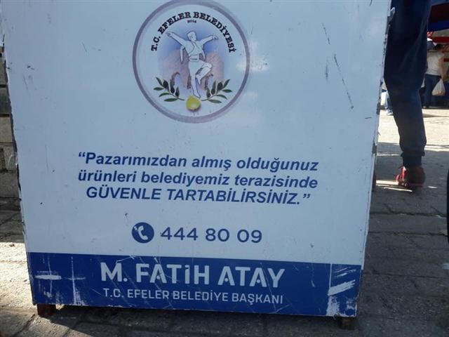 MHP Efeler İlçe Başkanı Ahmet Baskın 'Efe kent pazar yerinde çözüm bekleyen bir çok problem varken; Efe kent pazar yerinin girişine elektronik tartı koyarak vatandaşın aldıklarını tartmasını bekleyen Efeler Belediyesi; pazarcı esnafını güvenmediğini, zabıta hizmeti veremediğini, ölçü ve tartı aletlerinin denetimini yapamadığını itiraf etmiş; kıymetli hemşerilerim ile değerli pazarcı esnafımız arasındaki güveni sarsmıştır.
