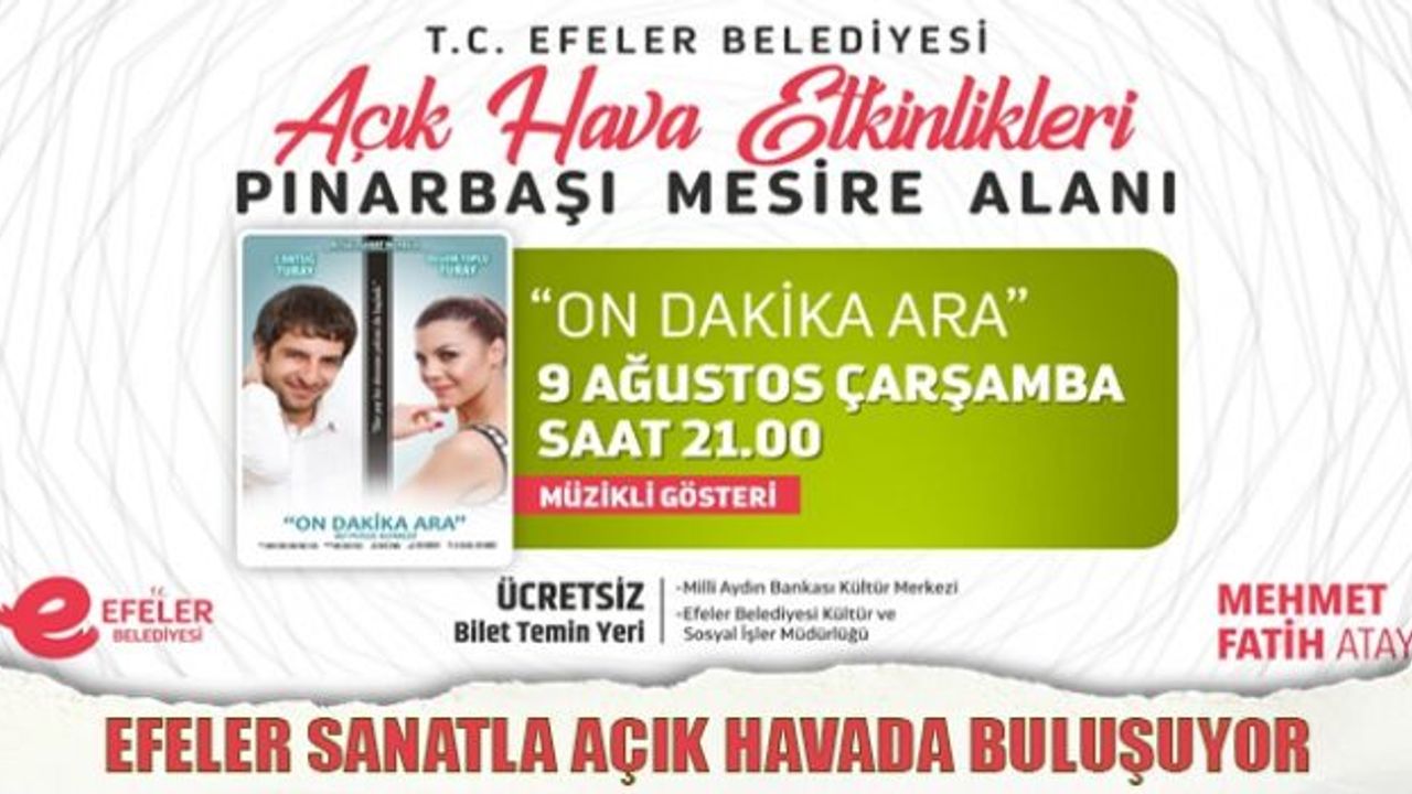 AYDIN (İHA) - Göreve geldiği günden bu yana hayata geçirdiği projeler ile Efeler'i 'Marka Kent' yapmak için çalışan Başkan Atay, temel belediyecilik hizmetlerinin yanı sıra şehirde çok sayıda kültür sanat etkinliğine öncülük ediyor. 9 Ağustos Çarşamba Günü saat 21.00'de Pınarbaşı Mesire Alanı'nda gerçekleştirilecek etkinlikler çerçevesinde ekranlardan tanıdığımız Cantuğ Turay ve Begüm Topçu Turay 'On Dakika Ara' isimli müzikli eğlencede, sürpriz performansları, anlatıları ve müzikleri ile izleyicilere keyifli anlar yaşatacak.