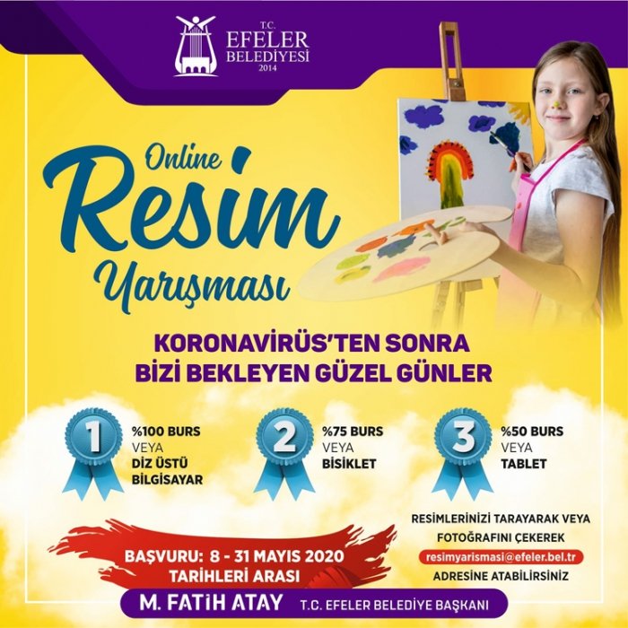 Efeler Belediye Başkanı M. Fatih Atay'ın talimatıyla Efeler Belediyesi, yeni tip korona virüs salgını ile mücadele kapsamında uygulanan tedbirler nedeniyle, evde kalmak zorunda kalan çocuklar için online resim yarışması organize etti. Kentte yaşayan 7-14 yaş arası çocukların katılabileceği yarışmanın teması 'Korona Virüsten Sonra Bizi Bekleyen Güzel Günler' olarak belirlendi.