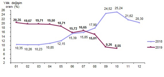 Türkiye İstatistik Kurumu( TÜİK) Ekim ayı enflasyon rakamlarını açıkladı. Buna göre 2019 yılı Ekim ayında bir önceki aya göre %2,00, bir önceki yılın Aralık ayına göre %10,59, bir önceki yılın aynı ayına göre %8,55 ve on iki aylık ortalamalara göre %16,81 artış gerçekleşti.