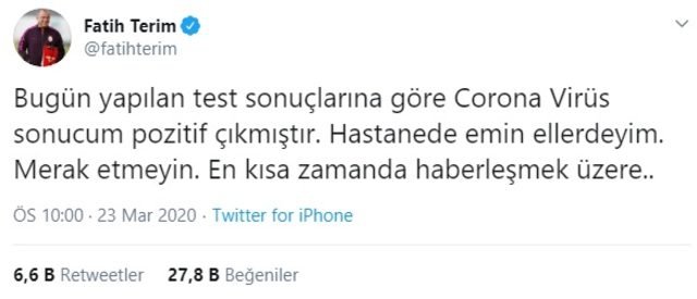 Terim resmi twitter hesabından yaptığı açıklamada ''Bugün yapılan test sonuçlarına göre koronavirüs sonucum pozitif çıkmıştır. Hastanede emin ellerdeyim. Merak etmeyin. En kısa zamanda haberleşmek üzere..'' ifadelerini kullandı.