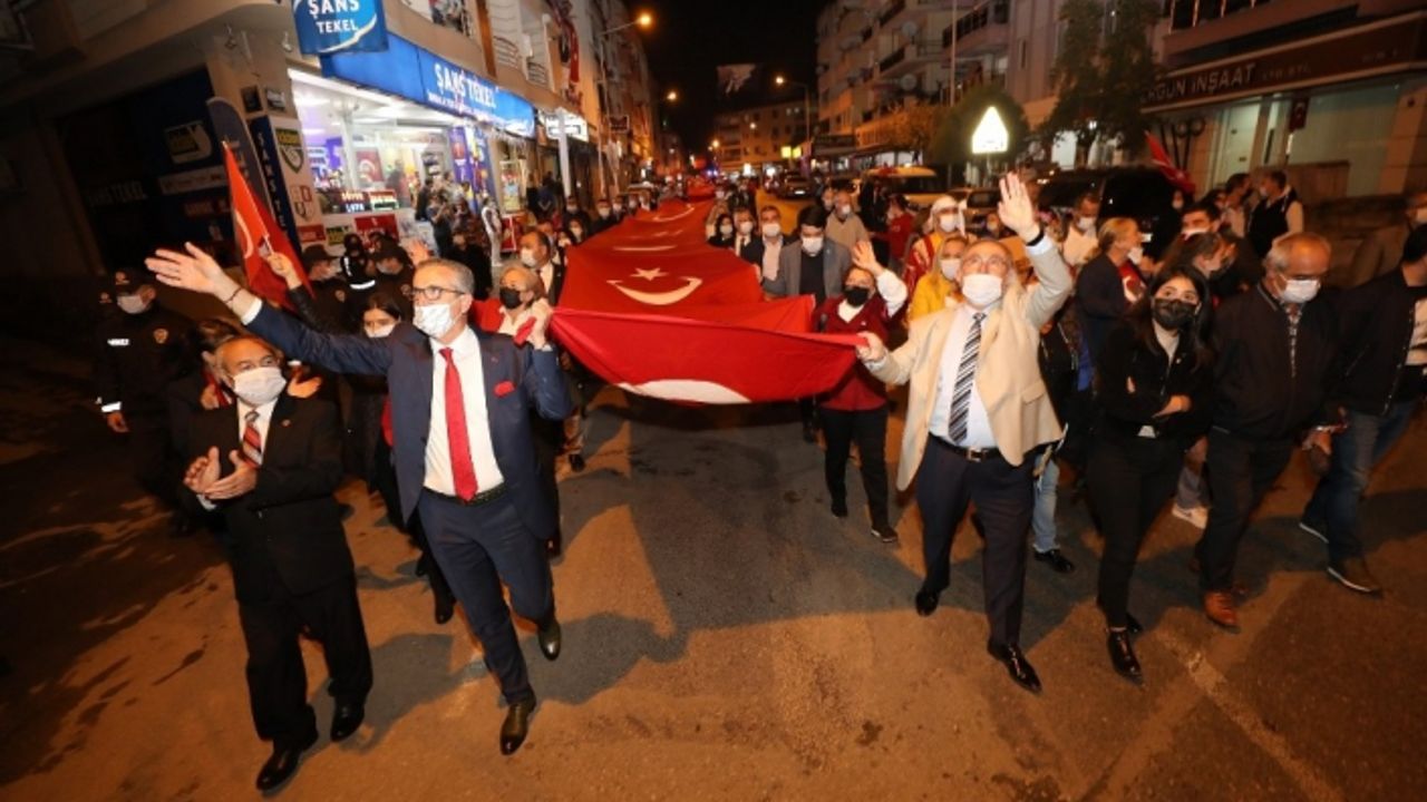 Gaziemir Belediyesinin 29 Ekim Cumhuriyet Bayramı kutlamaları Cumhuriyet Korteji ile başladı. Pandemi kuralları gereği katılımın sınırlı tutulduğu Cumhuriyet Korteji´nde, Abdullah Arda Meydanı´nda toplanan Gaziemirliler, Abdülhamit Yavuz Caddesi ve Atatürk Bulvarı güzergahı üzerinde bayraklarıyla yürüdü. Gaziemir Belediye Başkanı Halil Arda´nın eşi Deniz Arda ile birlikte katıldığı korteje CHP Gaziemir İlçe Başkanı Kasım Özkan, kadın ve gençlik kolları üyeleri, İYİ Parti Gaziemir İlçe Başkanı Sedat Gök, belediye başkan yardımcıları, meclis üyeleri, STK temsilcileri, muhtarlar ve Gaziemirliler katıldı. Ellerindeki Türk bayraklarıyla sokakları bayram yerine çeviren Gaziemirlilere, bazı vatandaşlar da evlerinden alkışlarla destek verdi. Büyük boy Atatürk posteri ve Türk bayrağının taşındığı, meşalelerin yakıldığı korteje bayraklarıyla katılan Gaziemirliler bando eşliğinde marşlar söyledi. Cumhuriyet Korteji, bandonun notalarına marşlar ve şarkılarla eşlik ederek Gaziemir Festival Alanı´na ulaştı. Gaziemir´de kortej yürüyüşüyle başlayan bayram coşkusu festival alanındaki Kafkas Kartalları Dans Topluluğunun dans gösterisi ve Yılmaz Demirtaş´ın seslendirdiği marşlarla devam etti. Kafkas Kartalları Dans Topluluğu sahneledikleri Kafkas yöresi halk oyunlarıyla izleyenlere görsel şölen yaşattı. Yılmaz Demirtaş ise seslendirdiği marşlarla bayram coşkusunu zirveye taşıdı.