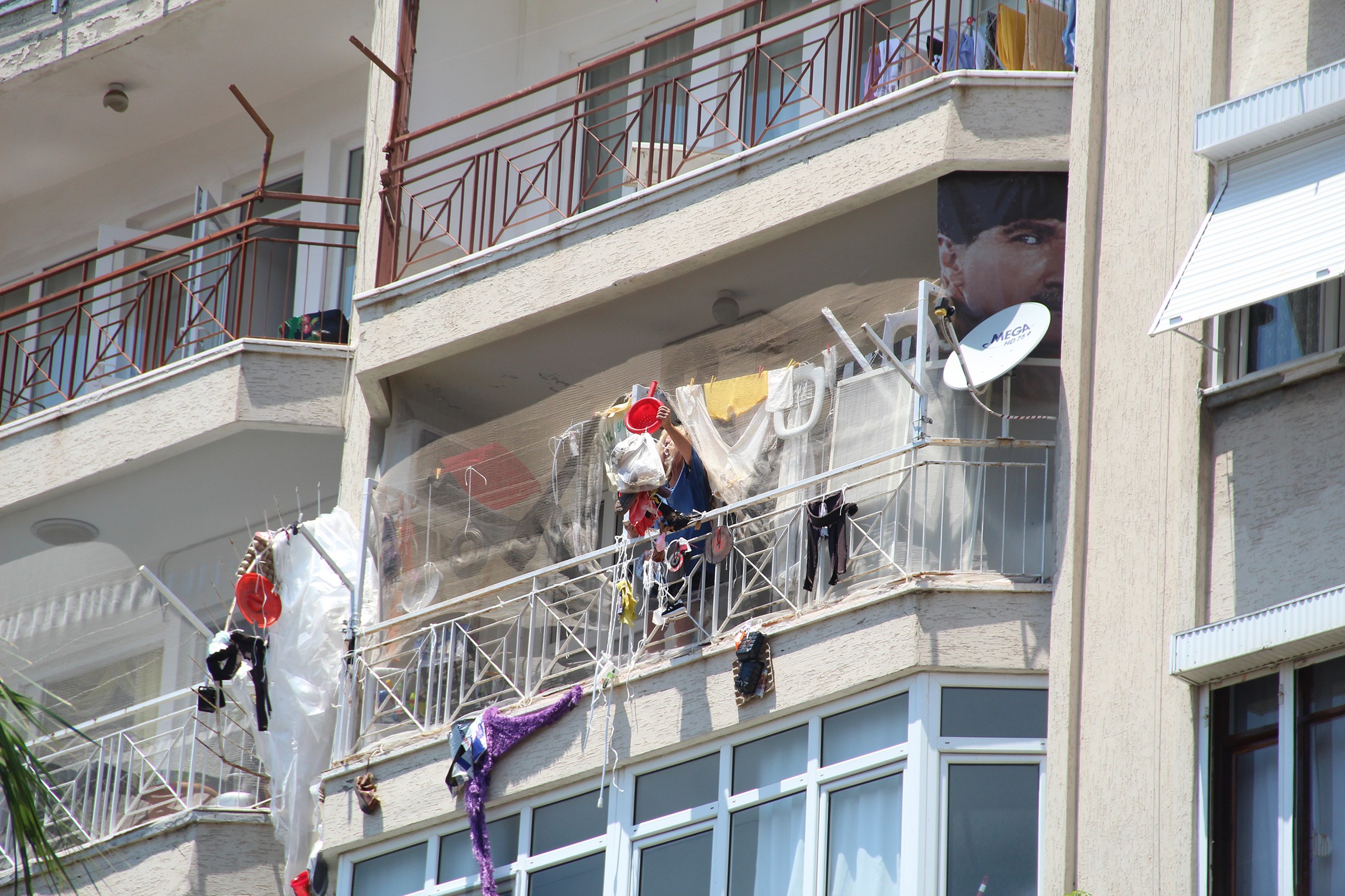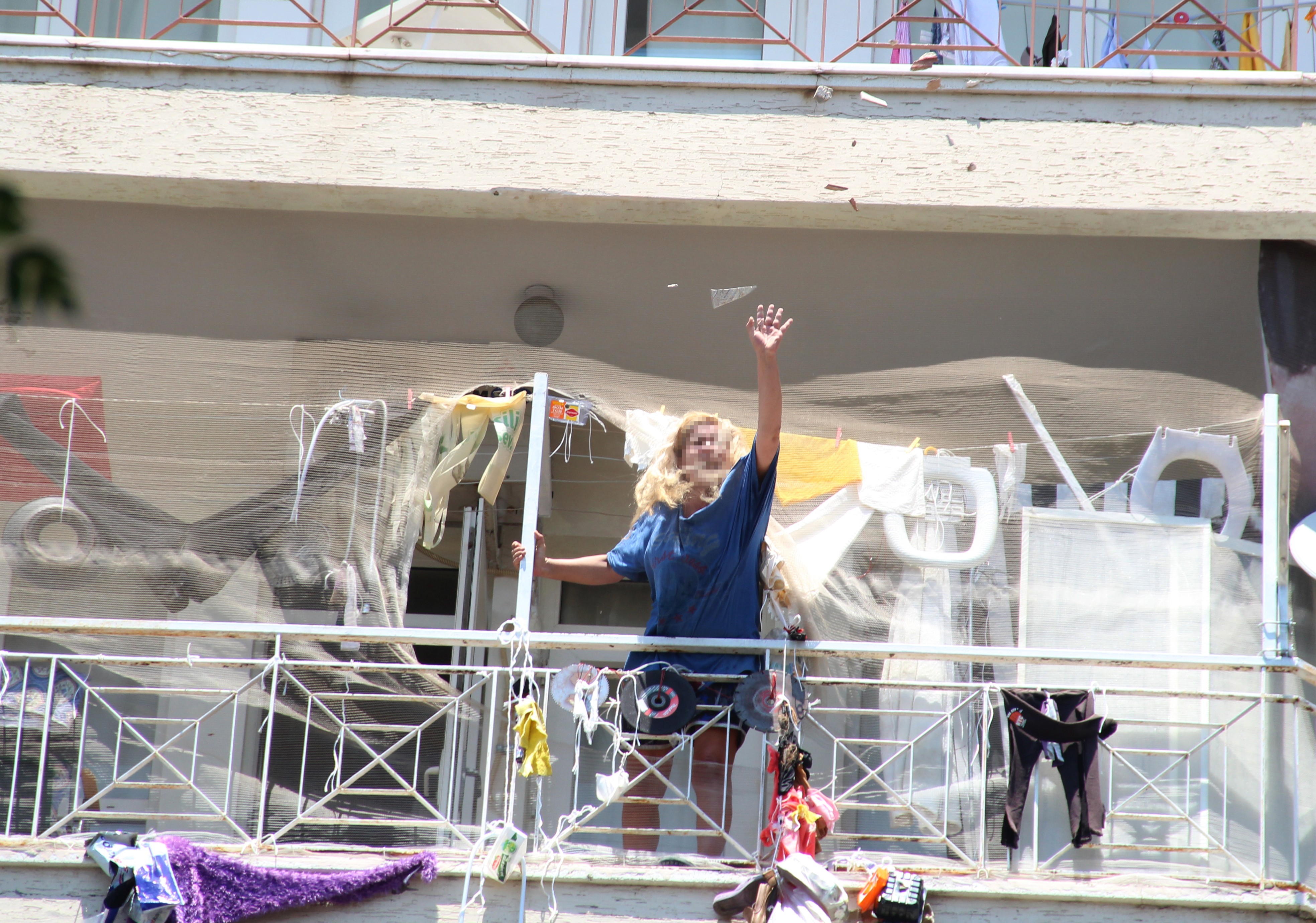 Genç kadın dün gece saatlerinden itibaren ise mahalleliyi sabaha kadar bağırarak ve çevreye elindeki eşyaları atarak rahatsız etti. Kadının şiddetini arttıran hareketleri karşısında vatandaşlar durumu 112 Acil Çağrı Merkezi'ne bildirdi. İhbarla bölgeye polis, sağlık ve itfaiye ekipleri sevk edildi. Sevilay T., balkonundan etrafa bağırmaya, elindeki taş, kum ve diğer eşyaları atmaya devam etti. Meraklı vatandaşlar ise hem olayı izledi hem de o anları cep telefonu kamerasıyla kaydetti. Karşı binadan bir şahıs ise kadına, 'Bıktık senden kendini at aşağı, Antalya'ya rezil olacaksın, kamera çekiyor seni. Mahalleliyi bıktırdın. İstemiyoruz seni git buradan. Taşı bana atma kendini at' diye tepki gösterdi. Kadının çok sayıda çöpü balkonuna astığı görüldü.