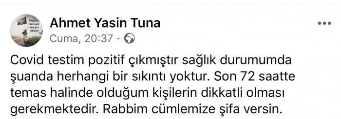 Edinilen bilgiye göre, izin gününde memleketi Konya'ya ailesinin yanına giden Ahmet Yasin Tuna, geçtiğimiz hafta izinden döndükten sonra yaşadığı sağlık sorunlarının ardından kendisinden şüphelenerek doktor kontrolüne gitti. Kontrollerde test sonuçları pozitif çıkan Tuna sosyal medya hesabından yaptığı açıklama ile 'Covid testim pozitif çıkmıştır sağlık durumumda şuanda herhangi bir sıkıntı yoktur. Son 72 saatte temas halinde olduğum kişilerin dikkatli olması gerekmektedir. Rabbim cümlemize şifa versin' dedi.