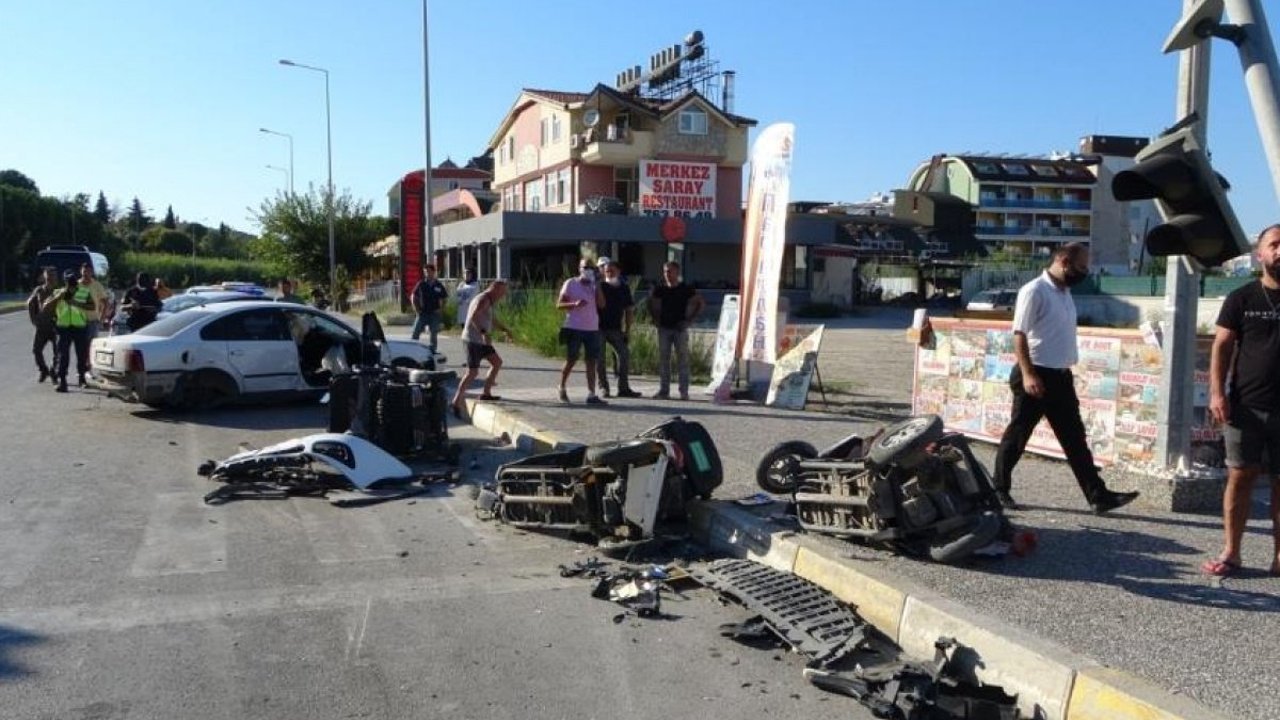 Kaza yapan 42 AAN 94 plakalı araç, çarpışmasının şiddetiyle turistlere kiraya verilmek üzere yol kenarında park halinde bulunan ve bir rent a-car firmasına ait olduğu belirlenen 3 adet elektrikli motosiklete çarptı. Elektrikli motosikletlerden 2 tanesi kullanılamaz hale gelirken etrafa saçılan otomobil ve motosiklet parçaları ortalığın savaş alanına dönüşmesine neden oldu.
