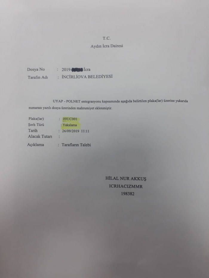 Son birkaç gündür aracın İncirliova Belediye şantiyesi ve Başkanın deve damlarında tutulduğu iddia edilirken, bugün belediye binası önünde görülünce polis tarafından hakkında yakalama müzekkeresi bulunan araç haciz edilmek istendi. Ancak İncirliova Belediyesine ait iş makinaları aracın haciz edilmesini engelledi. Küçük çaplı bir gerginliğin yaşandığı belediye önünde bekleyiş devam ediyor.