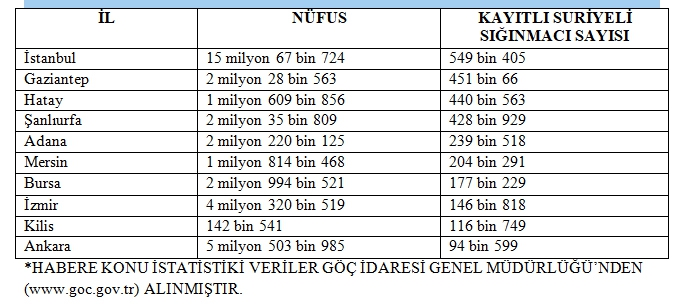 TÜRKİYE GENELİ KAYITLI SURİYELİ SIĞINMACI SAYISI EN FAZLA OLAN İLK 10 İL