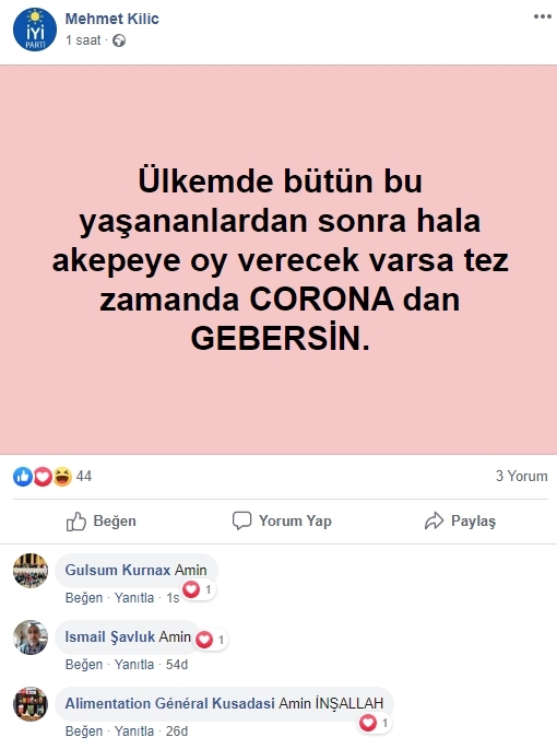 Geçtiğimiz Şubat ayında Aydın'ın Söke ilçesinde gerçekleştirilen İYİ Parti Söke ilçe Kongresi'nde güven tazeleyen Çağlar Çelikez'in yönetiminde bulunan Mehmet Kılıç'ın ismini taşıyan sosyal medya hesabından yaptığı paylaşım büyük tepki topladı. AK Parti'ye oy verecek olanların tüm dünyayı tehdit eden coronavirüse yakalanarak hayatını kaybetmesini dileyen Kılıç'a tepki yağdı.