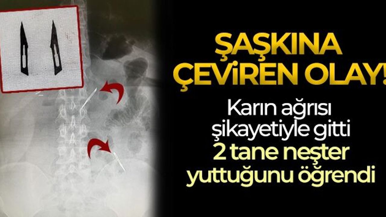 Başkent'te karın ağrısı şikayetiyle hastaneye başvuran 46 yaşındaki kadının midesinde 2 adet neşter tespit edildi. Neşterlerin vücuduna nasıl girdiğini bilmediğini söyleyen kadın, ekmek ile birlikte yutmuş olabileceğini ifade etti. Gerçekleştirilen başarı operasyon ile neşterler vücudundan çıkarılan kadının sağlık durumunun iyi olduğu öğrenildi.