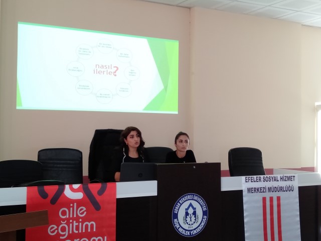 Efeler Sosyal Hizmet Merkezi tarafından verilen eğitimde, AEP Eğiticisi-Sosyal Çalışmacı Esengül Bulut, madde kullanım riski ve madde bağımlılığından korunma, AEP Eğiticisi -Sosyolog Tuğba Eroğlu 'Bağımlılık Yapıcı Maddeler' konuları ile dinleyicilere bilgi verdi.