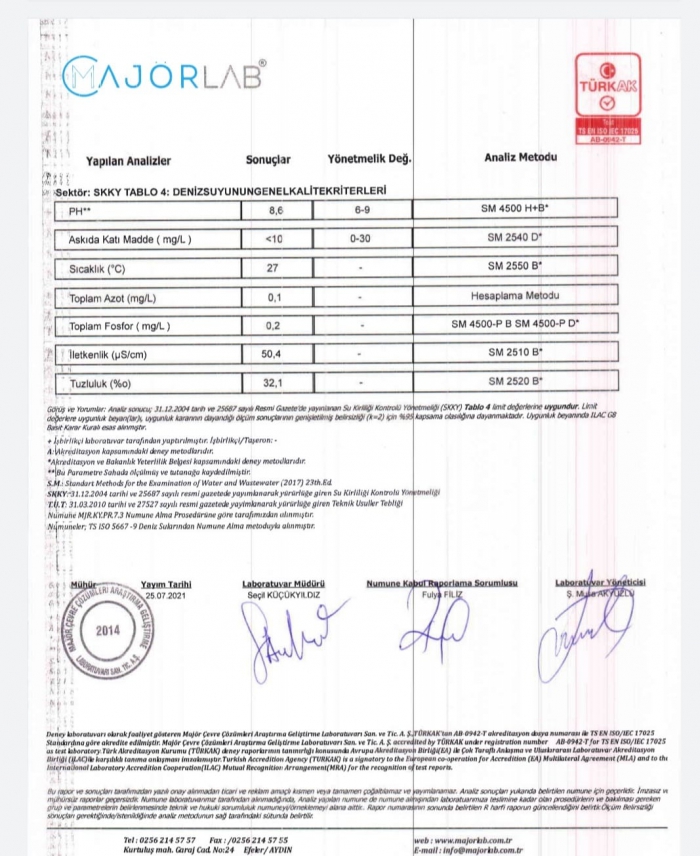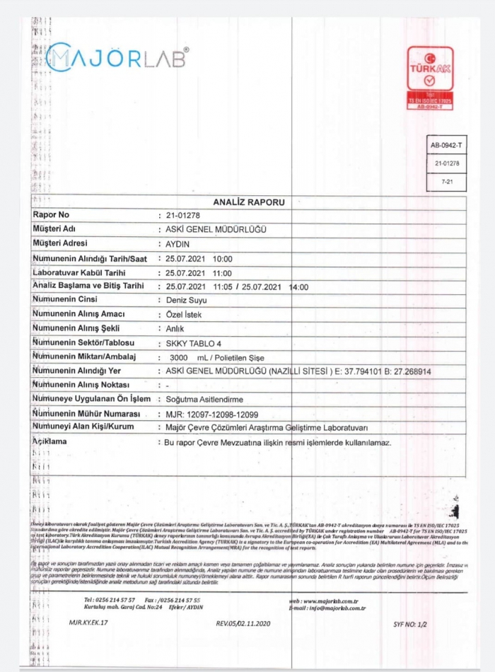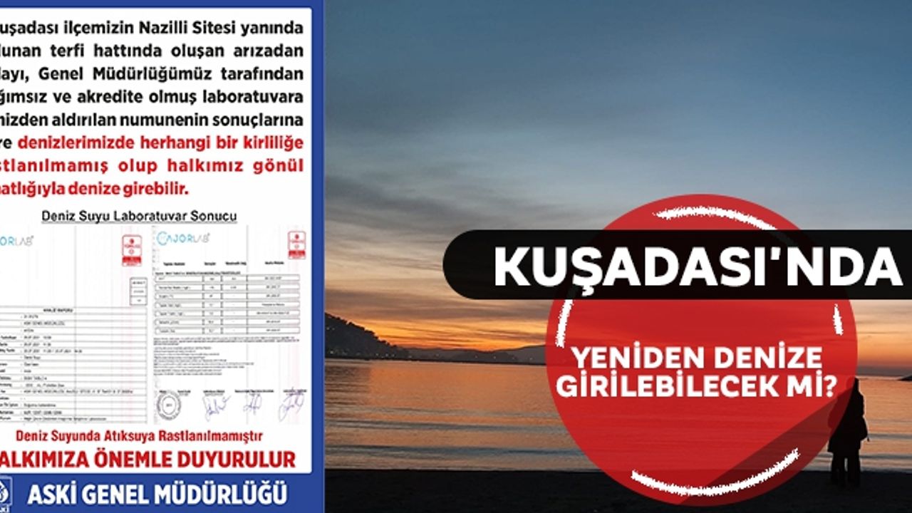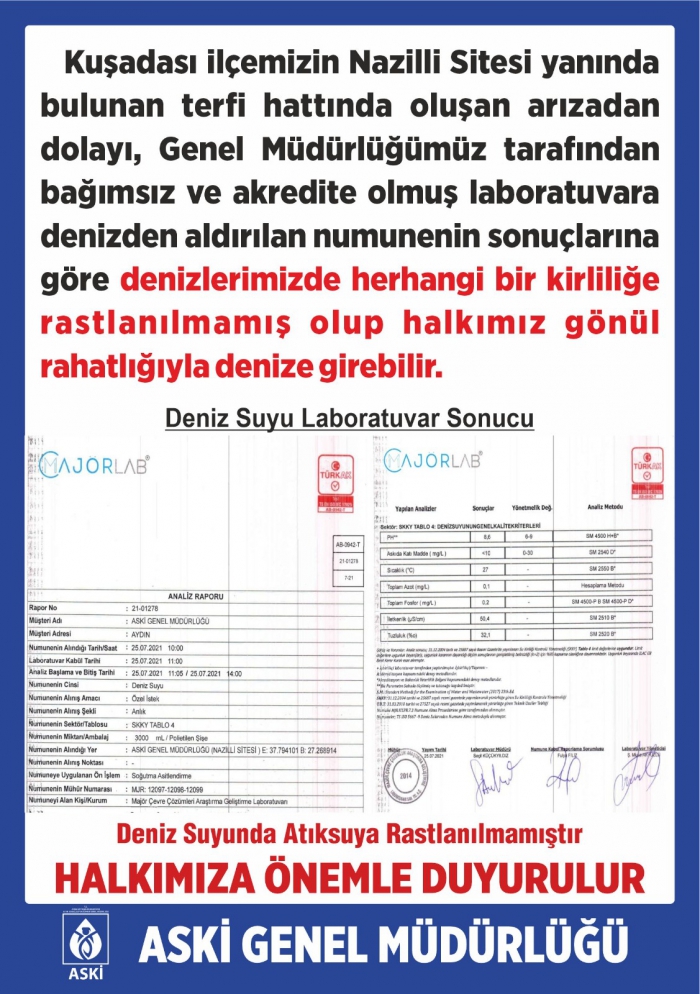 Kuşadası'nda Nazilli sitesi yanında bulunan terfi hattında oluşan arızadan dolayı, Genel Müdürlüğümüz tarafından bağımsız ve akredite olmuş laboratuvara denizden aldırılan numunenin sonuçlarına göre denizlerimizde herhangi bir kirliliğe rastlanılmamış olup halkımız gönül rahatlığıyla denize girebilir.