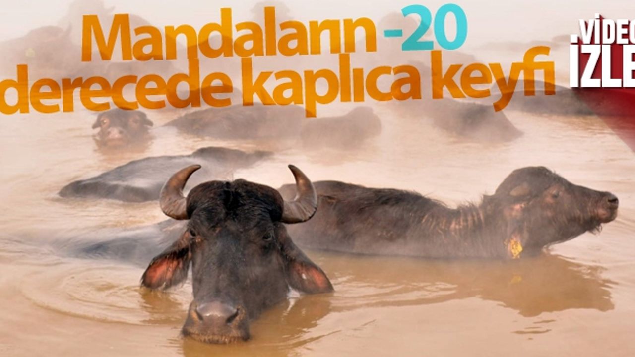 Sıcaklığın sıfırın altında 20 dereceye kadar düştüğü bölgede, etrafı karla kaplı kaplıcaya getirilen mandalarda suya alıştıkları için kaplıcayı görür görmez adeta koşarak suya giriyorlar.