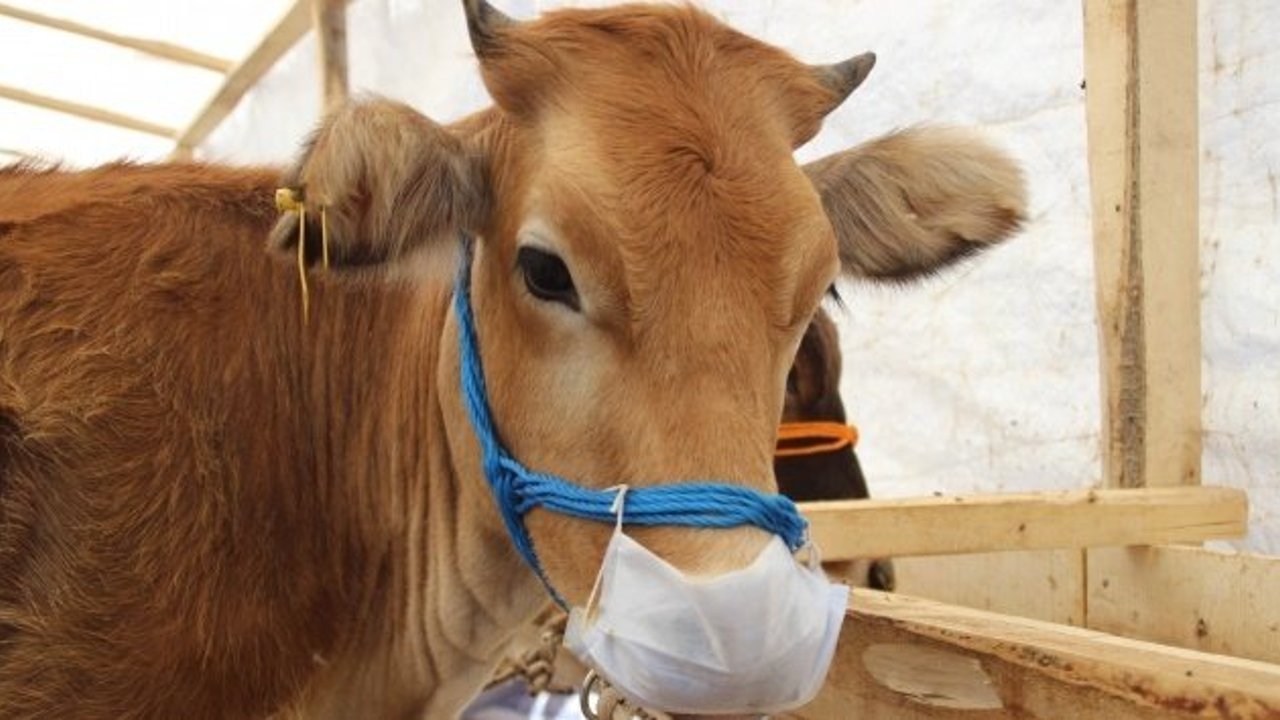 Kayseri'de bir besicinin gelen müşterilerine korona virüs farkındalığı oluşturmak için kurbanlık hayvana maske takması görenleri güldürdü.